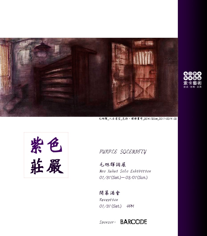 台北索卡艺术中心于01/31-03/01展出<紫色庄严-毛旭辉个展>,毛旭辉是大陆当代极具代表性的艺术家,为中国百大艺术权力人物之一,也是西南艺术群体的领军人物,80年代曾带领85新具象运动,在中国近代美术史有无可撼动的地位。毛旭辉以剪刀及椅子的符号物像闻名,历经三十载,两者的符号意义皆由当初的象征家国、封建及权力的投射,改变为对生命、死亡与亲情的隐喻。此次展出他持续创作的圭山系列、剪刀、倒下的靠背椅及封笔一年后展现全新风格的紫色系列,共计11件作品。