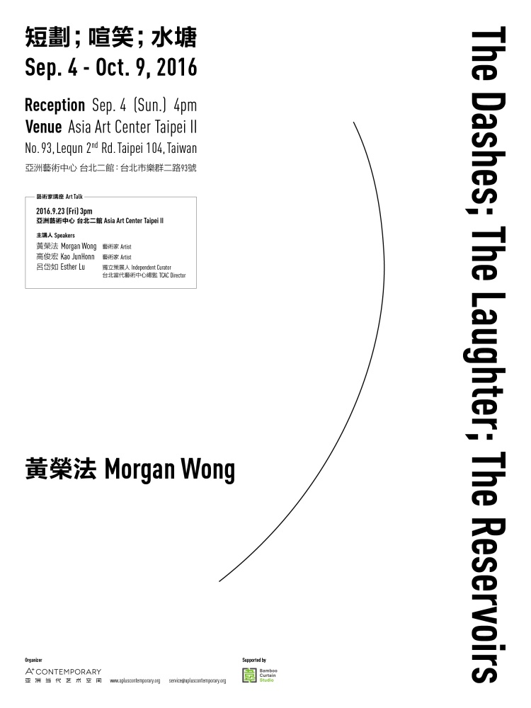 2016 年 9 月 4 日在亞洲藝術中心台 北二館舉行香港藝術家黃榮法在台灣的首次個展 「短劃;喧笑;水塘」。黃榮法把他對時間觀念 的探索延展至微觀及宏觀兩個相互纏繞的方向, 將個人對時間的感知及微敍事穿梭於歷史中不同 社會變遷的語境中。這次展覽以三件獨立卻帶關 聯的事件審視、嘗試尋求主權的時間性。在展期 中,A+ Contemporary 亞洲當代藝術空間也將主 辦黃榮法、高俊宏(藝術家)與呂岱如(獨立策 展人、台北當代藝術中心總監)的對談,講座將 於 9 月 23 日下午 3 點於亞洲藝術中心台北二館 進行。