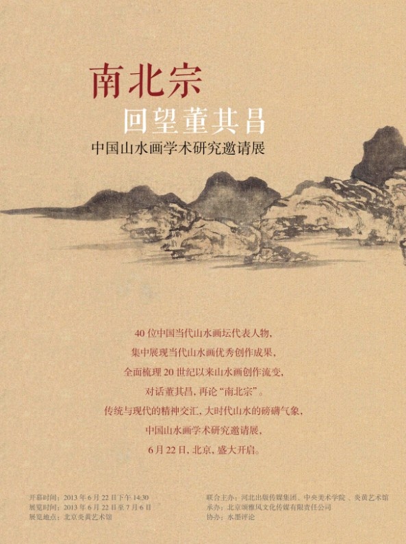 “南北宗——回望董其昌”中国山水画学术研究邀请展将于6月22日在北京炎黄艺术馆举办。此次展览由河北出版传媒集团、炎黄艺术馆、中央美术学院联合主办,由北京颂雅风艺术中心承办,“水墨评论”协办,主办方试图通过展览重新探讨中国美术史上“南北宗”这一重要的艺术理论。