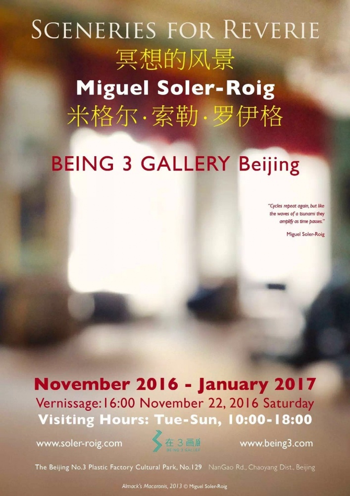 北京塑料三厂:在3画廊很荣幸的宣布,我们将于2016年11月22日至2017年1月7日在画廊的“三层月亮”空间举办特别项目,西班牙艺术家米格尔(Miguel Soler-Roig )的个人展览《冥想的风景》,展出他的两个最新系列的摄影作品——受到东方主义影响的《在安达鲁西亚的天空》以及充满批判、质问精神的《逻辑的歧义》。此展览将作为对刚刚结束的巴黎摄影展(Paris Photo)J.P.Morgan收藏单元展中米格尔作品表现的一个特殊回应,以及作为同时期在北京开幕的中国-西班牙美术馆馆长的特别项目单元。