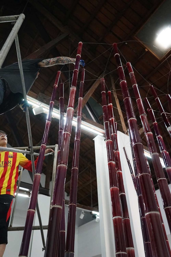 李承熙将他历时10个月创作的作品从江西景德镇运抵北京。其中近6500个陶瓷部件被分装在400个纸箱中,同时还有作为连接部件的700根钢管,以及70个钢铁底座。最终将连接构造成一个“朱陶竹林”。