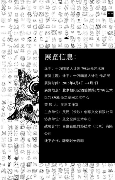 “十万喵星人计划“借助互联网独有的资源与传播方式保证了公众的广泛参与,巧妙地将作品收集的过程与活动的传播过程进行了结合,得到了有爱、有趣、有创意的用户们积极的响应。线上目标完满达成后,“十万喵星人计划“大型作品展也将于4月3日在北京798艺术区圣之空间开幕。运用互联网思维,艺术展览作品的作者被去中心化,同一主题下的作品数达到10万以上的展览不仅在中国前所未有,在全世界范围内也是史无前例的。