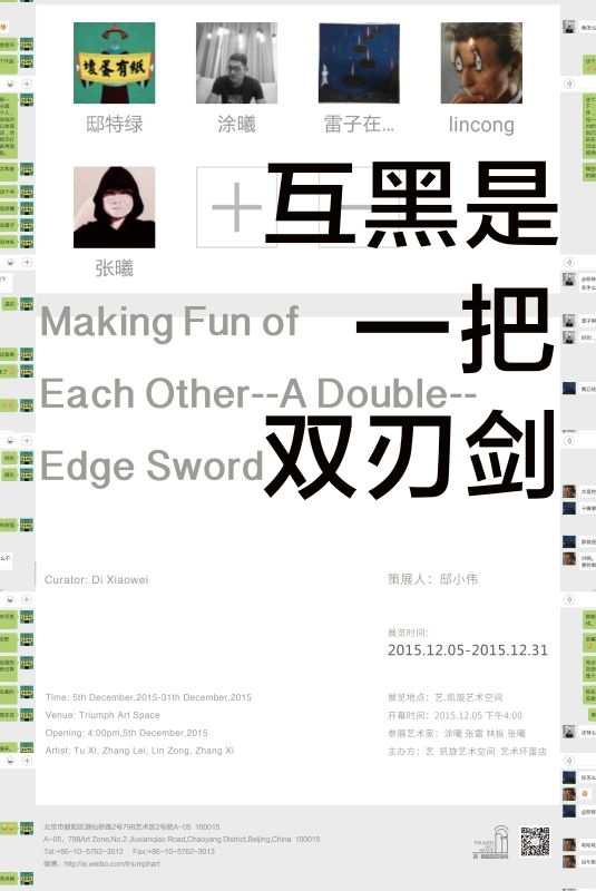 这是个由四位画家参与的群展,每个人对绘画的态度都有各自的认识和理解。他们相互攻击对方,不给对方反击交流的机会,这就是我们暂时的玩法。很多艺术家文化人批评家特别喜欢一起讨论艺术交流认识和看法,甚至讨论人类发展生存的话题。当然这是我比较厌恶的,我厌恶的不是讨论的内容,而是觉得这些话题更适合跟今晚我喝完酒打车回家和的哥在路上讨论,或者明天一早跟炸果子卖豆浆的好好探讨几分钟。