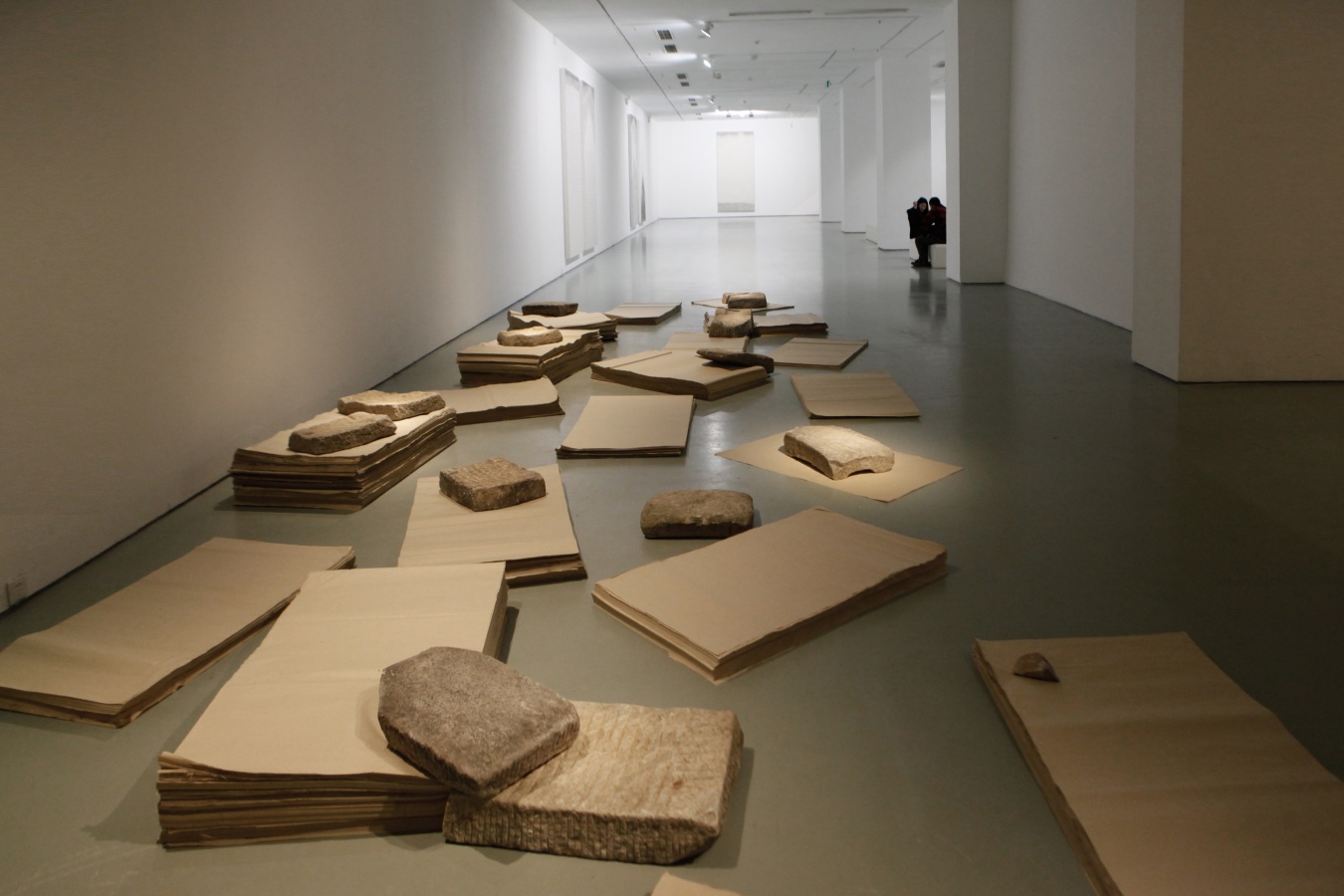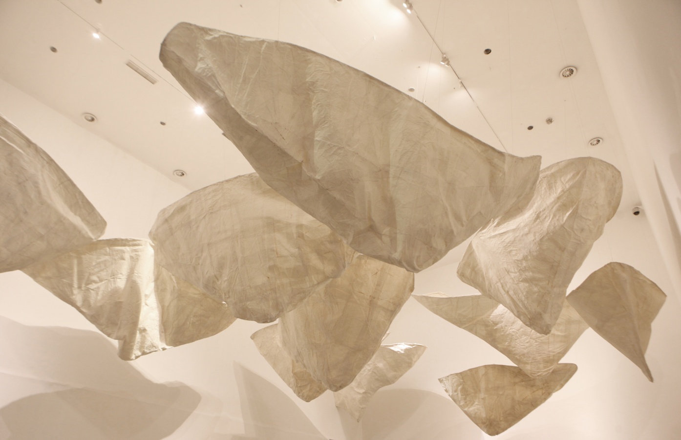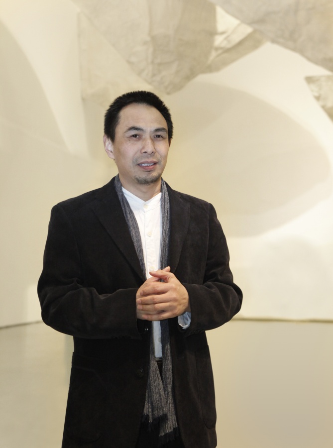 汪一舟是一位具有广阔视野的艺术家,其创作贯穿于书法、水墨、油画、装置,作品呈现出简洁、质朴、诗性、沉厚的语言特征。由于深受中国哲学自然观之影响与启迪,他以传统宣纸为表现媒介,将之转化为三维形态,采用观念介入空间的方法,使物质性获得充分发挥和自然展现,所呈现的装置/雕塑通过悬浮(具体说是山的倒悬)占据了巨大的空间,营造出一种异样的诗境。