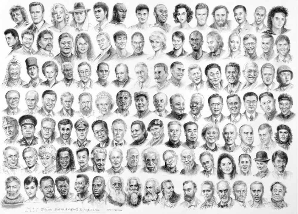 中国艺术家戚发旭创造了一个新的世界纪录,在一张4K(39X54cm)纸上画了110个世界名人袖珍素描肖像。包括中国作家莫言。