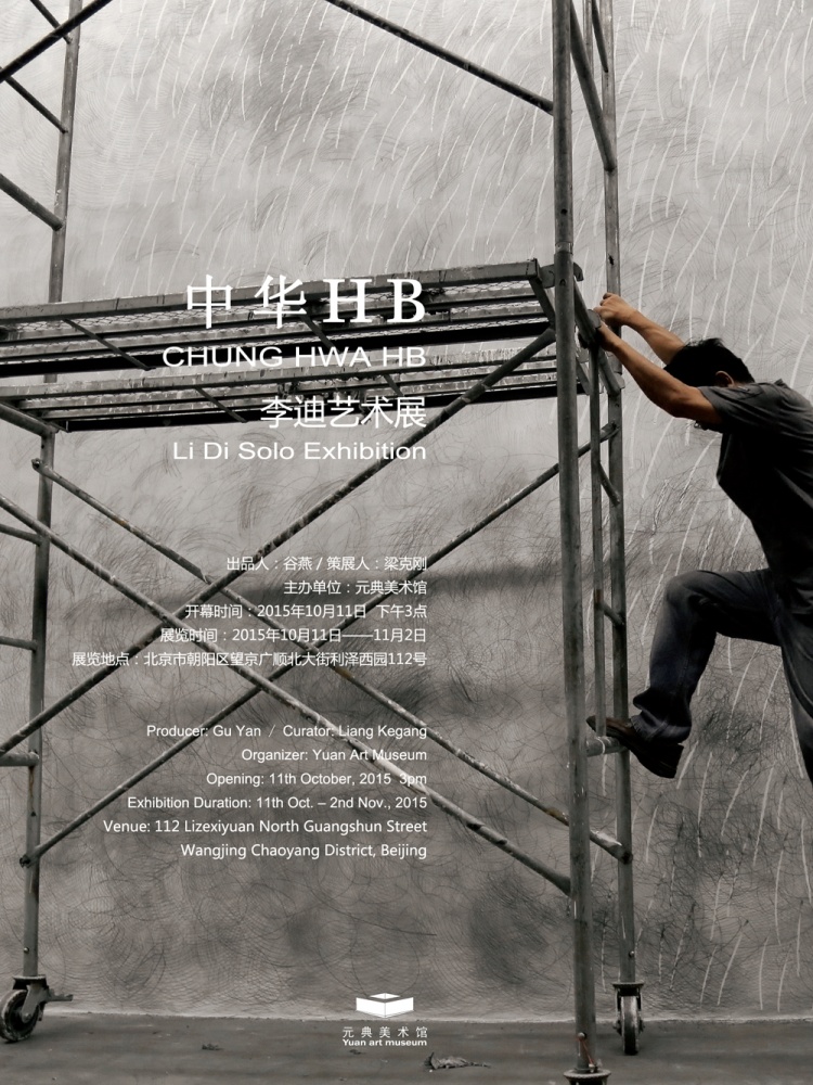 基于这些前提,这个展览变得更为挑战,经历了几个月的苦思冥想,李迪决定这件原本计划根据元典美术馆空间现场的唯一展出的作品,不能够去为了画一个什么东西而创作,而是应该试图尝试一下能否去不画一个什么东西,这是一个创作理念上的巨大的不同,以往艺术家的创作总是带有太强的主观意愿,总是我想画什么我想表达什么我想让别人看到什么,尤其当代艺术以观念为核心的价值系统更是要求作品不能没有“想法”,创作过程不能没有“观念”,然而一个力求去除主观意愿和想法并且不想去画出一个什么的过程是否也会是另一种更加有趣的观念呢?为此元典美术馆特地为李迪此次展览的现场创作重修了一面墙,李迪在十天内只用最简单的一种型号的铅笔,争取以毫无目的毫无章法毫无主观意愿的状态把整面墙画满,希望剔除绘画的概念,放弃追求绘画性,只强调“绘制”本身的行为与过程,不预设结果,争取呈现一种随机、偶然和不做控制的结果呈现,甚至都不能称之为一种“结果”而是一种特定时段“绘制”的行为过程终止的状态记录。之所以采用一种型号的铅笔其实是隐喻回到绘画的原点,所有学习艺术学习绘画的人在开始的时期都会被教会用铅笔开始素描和造型的基础训练,铅笔在这里有着极强的象征意义也让艺术家很有亲切感,而此次李迪的个展名字就叫“中华HB”就是想剔除所有的概念、意义、问题,客观而中性地将观者引入艺术家试图呈现出的对于艺术、对于绘画、对于创作以及展览机制所进行的反思,从而引发更多的讨论和可能。