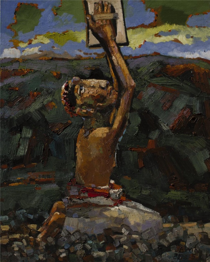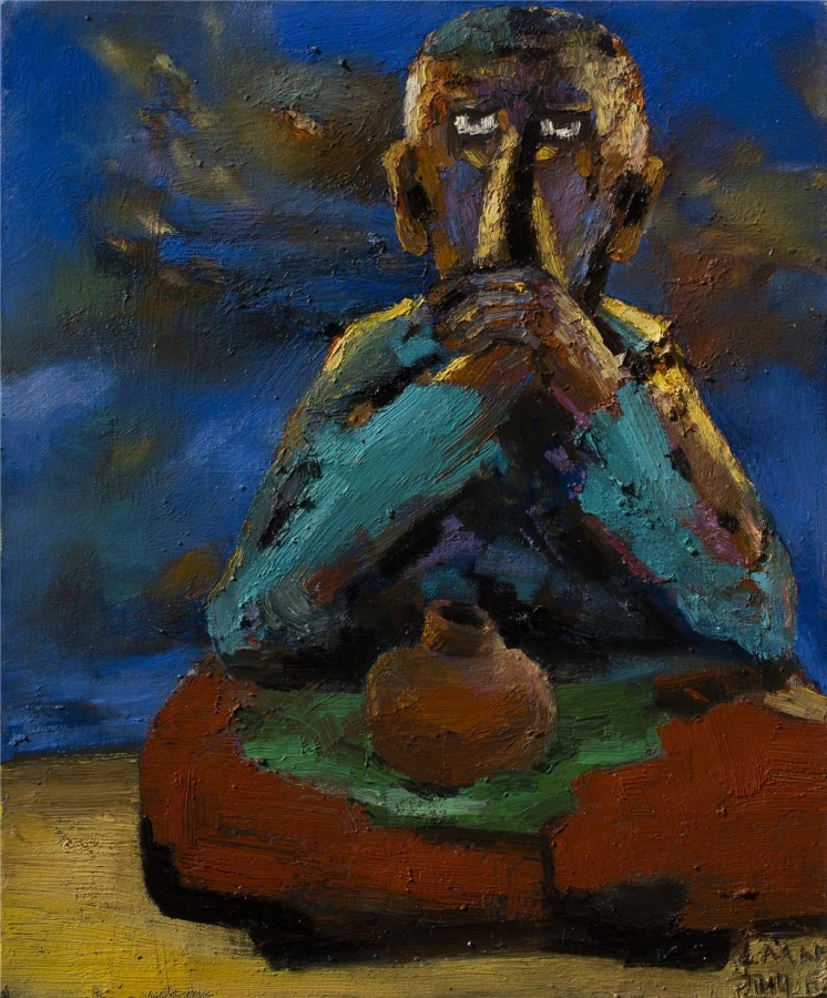 2011年是刘懋廿创作母题的分水岭。早期作品以陕北题材为主,为日常人物赋予“灵魂性”是该时期创作的主要特征。双手合十的人,沉思中的劳动者,抱着娃娃的老汉,骑在一起背箩筐的两个男人,这一系列的作品都被作者赋予更高层面的意义,从而超越一般写实作品的模拟。与其说刘懋廿是在用油彩绘制人物形象,不如说艺术家是在描绘一座由底层人物演变而来的“纪念碑”。艺术家仿佛是在建构一个强大的超现实的土地神,来改变普通农民靠天吃饭的命运。