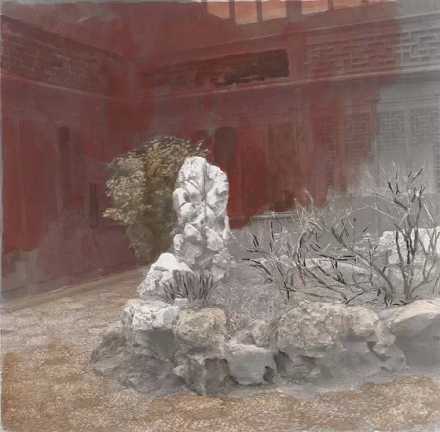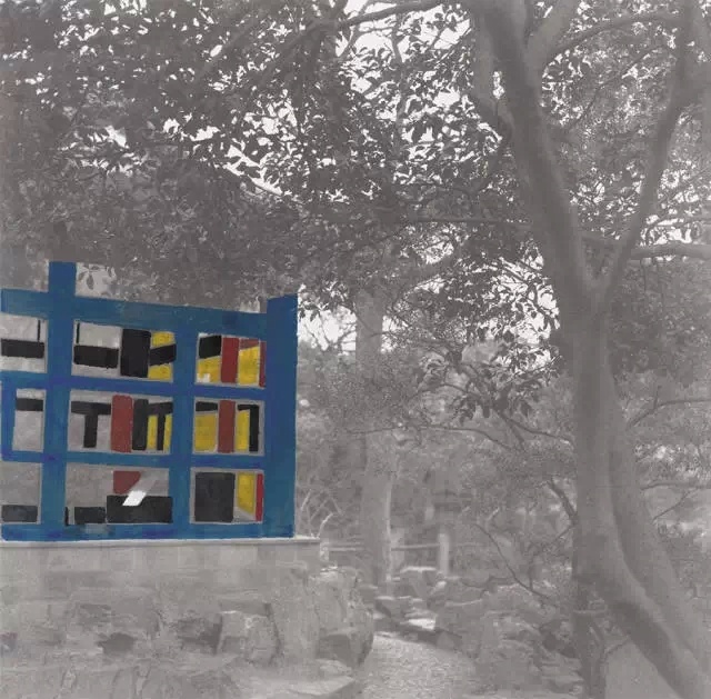 赵刚个展是围绕耦园而产生的,园主沈秉成当年为其园林取名耦园,出自《论语 • 微子》,寓园主夫妇偕隐双栖、啸吟终老之意。赵刚将个展题目定为《偶园》,口语中就是“我的园”,意在借历史线索,讲自己故事。这些作品是摄影和绘画的综合体,赵刚在铂金感光纸上记录了凹凸错杂的黄石假山、空寂无人的亭轩楼榭、临水的曲桥、蜿蜒的长廊、墙角的衰柳颓木和幽深的山林阴影,叠加的绘画又构成对真实性的篡改,园林和园图反叛性地构成了对立关系。在空间—摄影—绘画的转换过程中剥离了传统园图的乡愁和诗意,让我们看到林泉背后的荒芜和残酷。