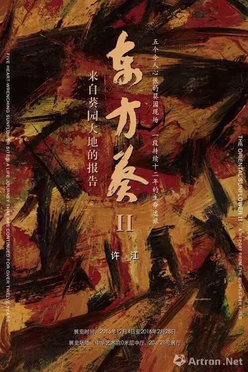 由中国美术家协会、中华艺术宫、中国美术学院共同主办的“东方葵Ⅱ--来自葵园大地的报告”许江艺术大展,将于2015年12月3日至2016年2月28日在上海中华艺术宫隆重展出。此次展览是许江近十二年创作生涯的集中展示,共展出“葵园”主题的大型油画作品六十余幅、系列水彩作品百余幅,以及一系列大型雕塑作品。