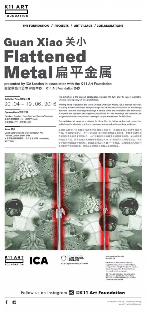 K11 Art Foundation (KAF) 欣然宣布再度与伦敦当代艺术学院(ICA) 合作,携手呈献中国新晋艺术家关小的首个英国个展《扁平金属》(Flattened Metal),展览将于2016年4月20日至6月19日在伦敦当代艺术学院举行。