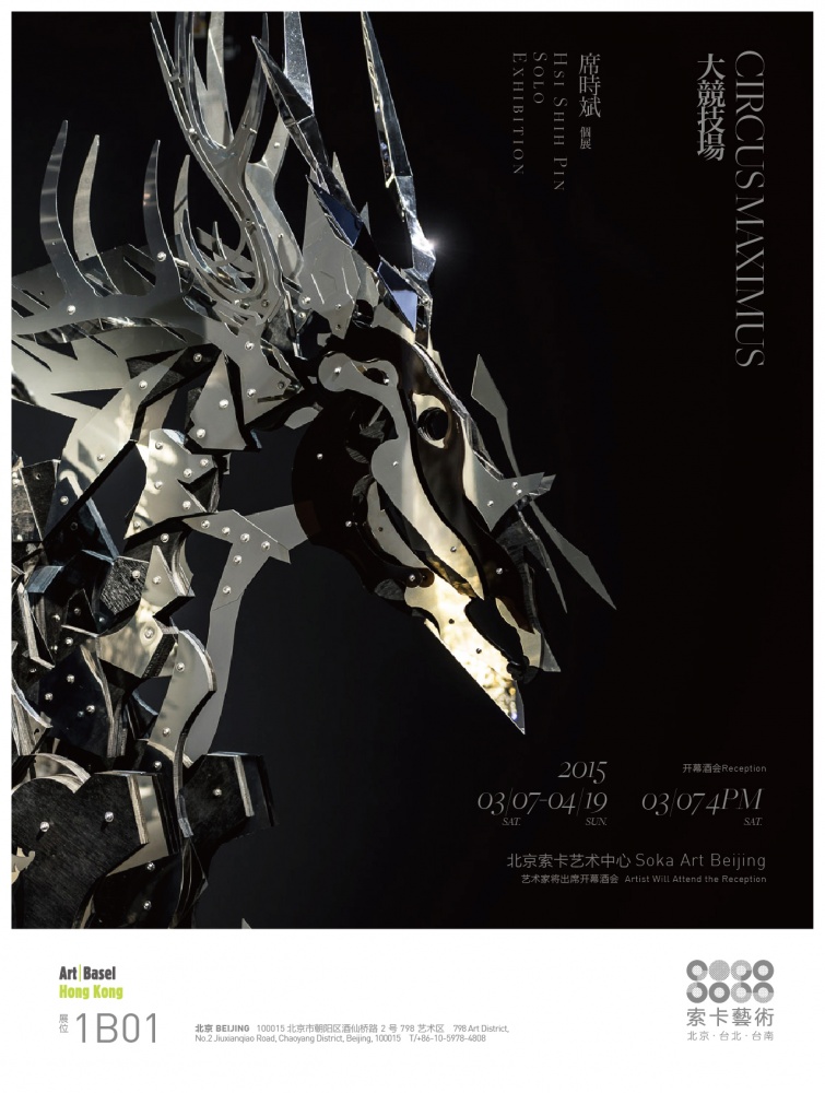 北京索卡艺术中心于2015年3月7日至4月19日举办“大竞技场——席时斌个展”,展出台湾新锐青年艺术家席时斌的13件作品。这是席时斌在北京的首个个展,更是台湾青年雕塑艺术家一次大胆且华丽的亮相。席时斌回归早期建筑制作的专业训练,将现存于世界上最大的古罗马时期竞技场遗迹概念做了一次完美的翻转,《大竞技场》一作更是将模型的几何空间拆解重组成带有菱形状且又光滑亮面的立体作品,展场配置上延续历时性的创作脉络,《蓝图》的重制、立体雕塑拆解后的墙上浮雕作品、《符号与记忆之马》、《圣母》、《星之狮》、《动物之门》等经典风格作品依次呈现。此次展览更是重现他目前最大型且气势最磅礡的作品《柏拉图的灵魂马车》于展场之内;他希望能于此次展览给出极高强度的物理与精神概念的综合,竞技场将成为他欲望的衍生,每一个不锈钢片都是一种微世界,是空间性的物理切片,更是时间性的显微放大。他将自己的内在浓缩进入世界,以一种莱布尼兹(Leibniz)式的矫饰主义呈献:席时斌以等量繁衍其自身的小宇宙观,分子化、微观化的动静快慢,不断地在运动着,他并将记忆倍增于作品的再现中造成全然的变种,于是《大竞技场》承载着他智慧的特质与高度摹仿的可能,这是一场席时斌对于自我的竞技,也是他下一个对于艺术创作的想象,更象征着他对于理性孜孜不倦的追求。