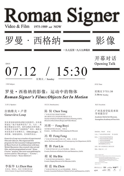 2015年7月12日下午15:00,“罗曼•西格纳:录像与电影——一九七五至一九八九和现在”展览将在广州美术学院美术馆开幕。该次展览由广州美术学院美术馆、华•美术馆主办,广州美术学院科研创作处、国际交流处、油画系、实验艺术系协办,同时获得了瑞士文化基金会上海办公室的鼎力支持。