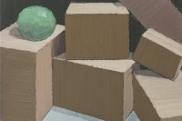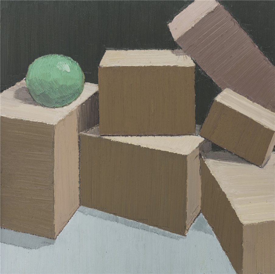 在更新近的作品中,赵新宇做了更多的减法,将造景的范围缩小到对个别物体的操控中。场景的身份被进一步弱化,画面成为某一个或几个物的特写镜头。赵新宇在思考图片与绘画的关系时,抱有“保证绘画性存在”的期望;在讨论空间、结构和色彩这些图像基本元素之外,他也着力强调绘画的独有媒介。此外,作品的油彩愈发厚重,以至于除了反复涂抹所产生的肌理之外,还因为颜料的体量和绘画工具的挑拨而出现了立体的质感。赵新宇试图以油画媒介的物质感来重塑画面中的物体,将物进一步物化为单纯的形,进而在绘画最强势的领域来塑造它们:形、色和光这些基本元素一下子摆脱了叙事、隐喻或者观念,成为了绝对的主角。