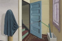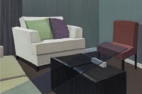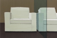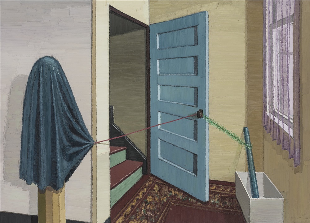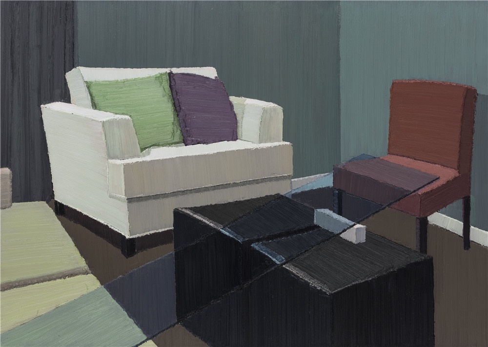 出生于1989年的赵新宇,毕业于四川美术学院油画系,擅长以“塑造物”和“改变景”来控制画面。他的毕业作品表现的是一系列明亮安静的车厢。放在桌上的茶杯暗示人的存在,但他将列车里应有的喧闹完全删除,只保留单纯的物。他采用了大量的平涂技巧,颜料堆砌出的干净色块营造出温暖的明暗对比和一种模糊的物质感。