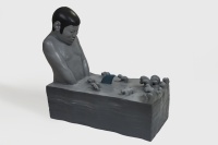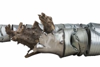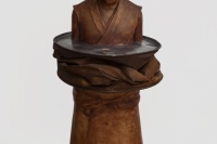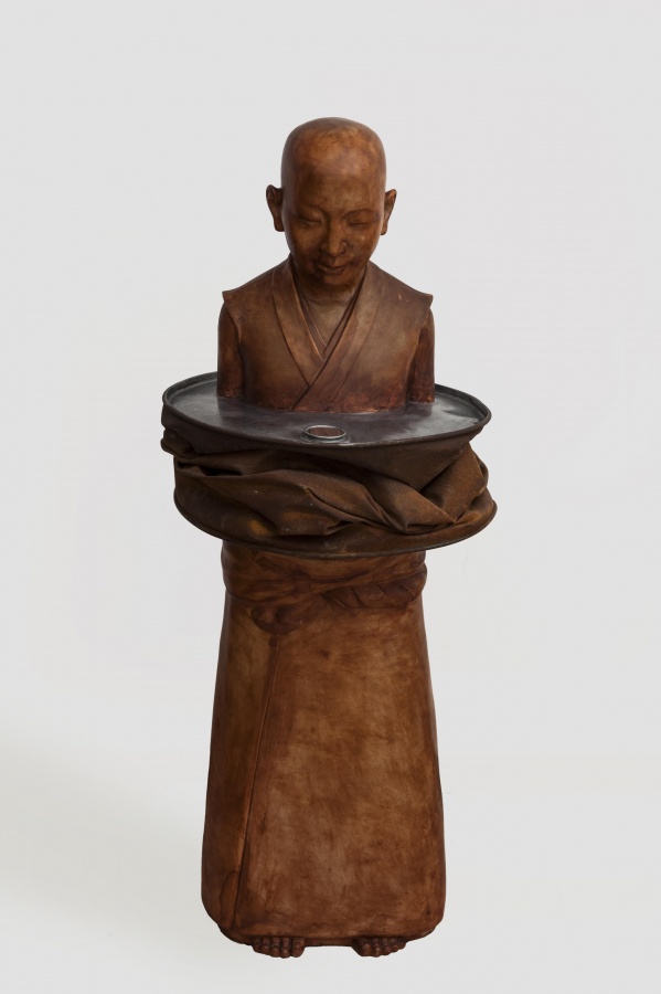 但是自然也容易让我们迷失其中。艺术家用艺术和反讽的方式来表达是非常有效的。正如在3画廊选择的这位艺术家——任宏伟,他运用自然之物,汽油桶,佛祖等元素会让人自然联想到自然智慧的永恒冲突。作品“解脱“,好像喇嘛的思想被压制了,思想和智慧想汽油桶一样被压扁了,也许在思想和人类暴力的对决中,思想输了,输给了大自然和人类自己;而作品“神龙”则恰恰相反,一个自然的树根作为龙头,仿佛要挣脱作为人类行为的象征物__油桶的挤压,它表现出很愤怒的样子,并定格在那里。自然之物要努力从这非自然之物中挣脱出来。