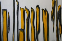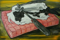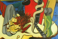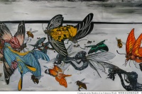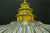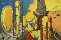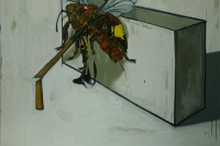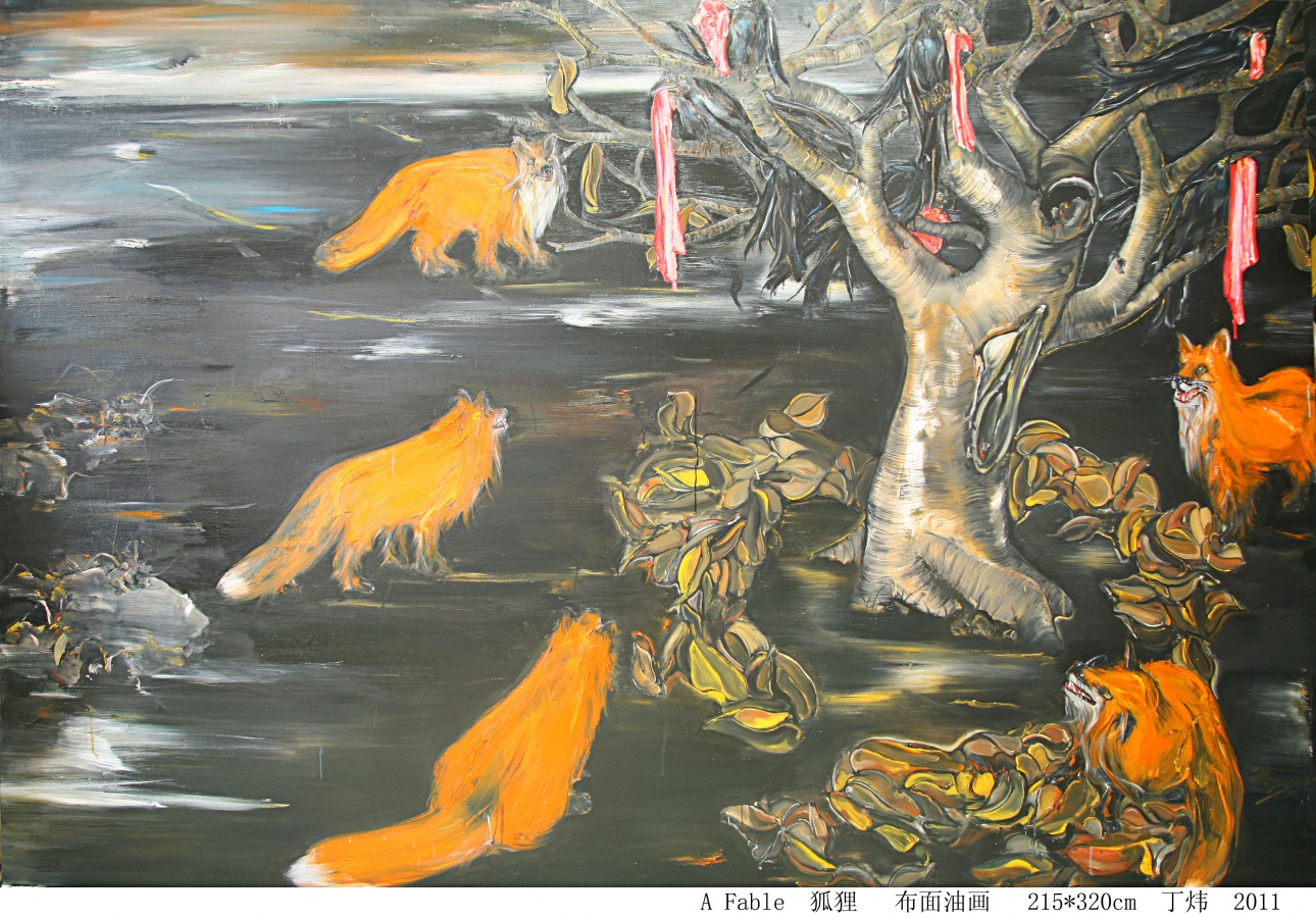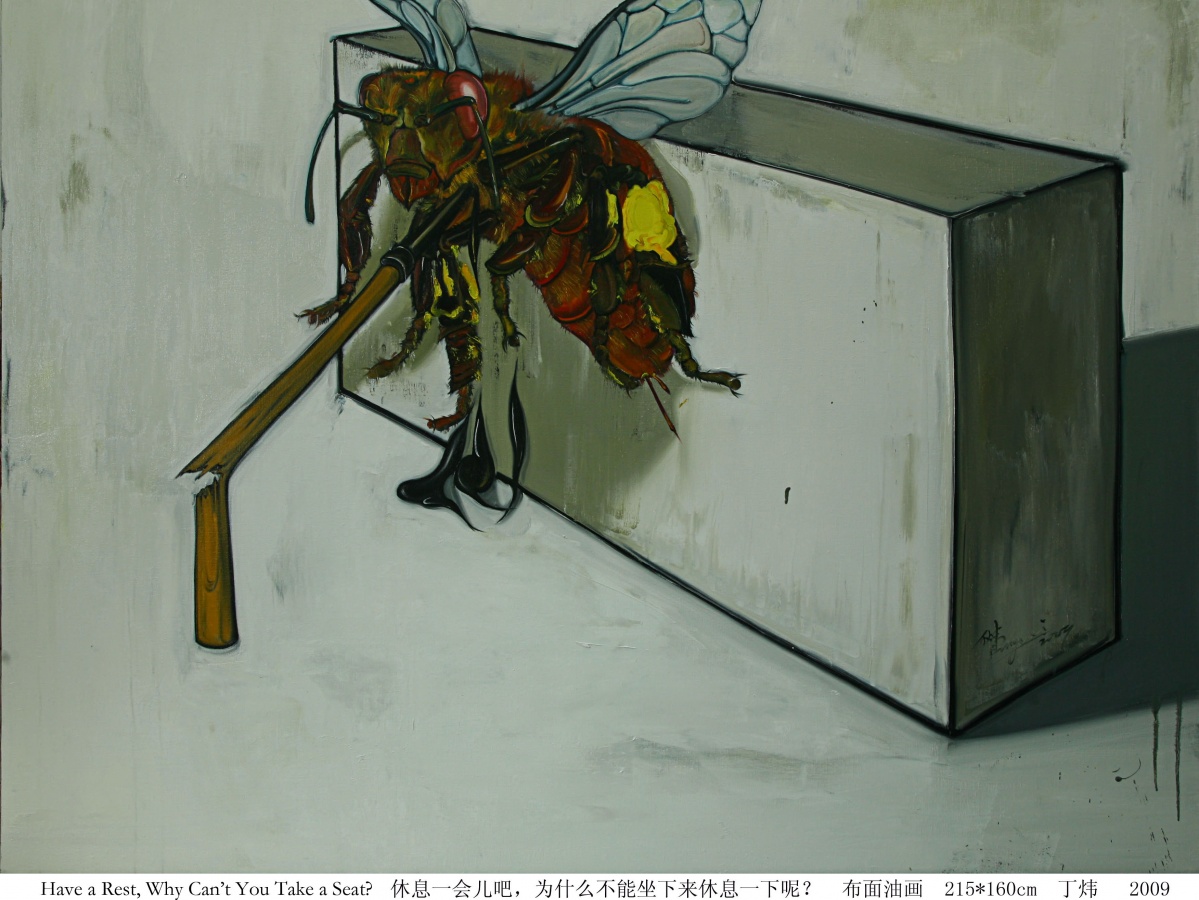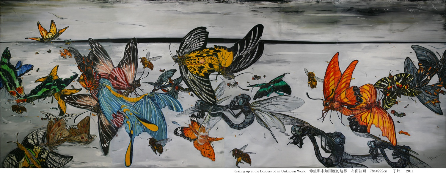 最近几年与丁炜的接触慢慢多了起来,也常去丁炜的画室去看看他的新作品也顺便聊聊,他是个愿意谈哲学谈艺术谈文化的人,每次都很认真诚恳地与我深入交流,这在现今弥漫着吃吃喝喝的奢靡之风的艺术圈已经并不多见了。近几年丁炜因为一种较难治愈的慢性病的折磨人也日渐消瘦孱弱,可是你仍能感受到他有着一颗强劲而火热的内心,他用画面构筑了一个想象中庞大而广阔的国度,而他自己正是那个驰骋在其中永不言败的英雄,有时候我看他的画似乎有着一种很奇妙的感觉,好像他自己就在这些画面之中,骑着马像一个独行骑士一样在经历那些胶着的战争、残酷的灾难、庄严的祭祀和热闹的集市,那些耸立在空旷荒原里的纪念碑正是他心中的某种引以为信仰的东西。丁炜不仅有着关注人类与世界命运的大情怀也有着对生命自身的感悟,他通过对蝴蝶、昆虫和一些动物形象的大量研究与描绘,表达出一种对于生命的脆弱无比怜惜的情绪,他还有着另外一类的作品又是极其冷静和理性的,好比一个外科医生解刨人体一样地一件件地摆弄不同的肢体和器官,他选择性地绘制一些他感兴趣的物件,荒诞的表述方式与纯粹主观的时空处置,抽离了这些事物的习惯属性,却让这些非常熟悉的日常事务瞬间变得陌生无比,呈现的却完全是一种符号化的特质,又像极了某种不明就里的隐喻。