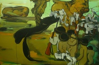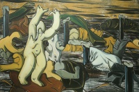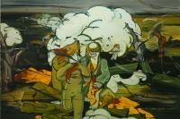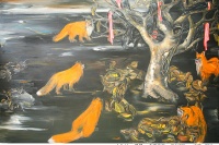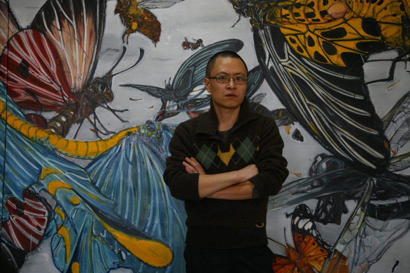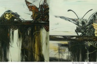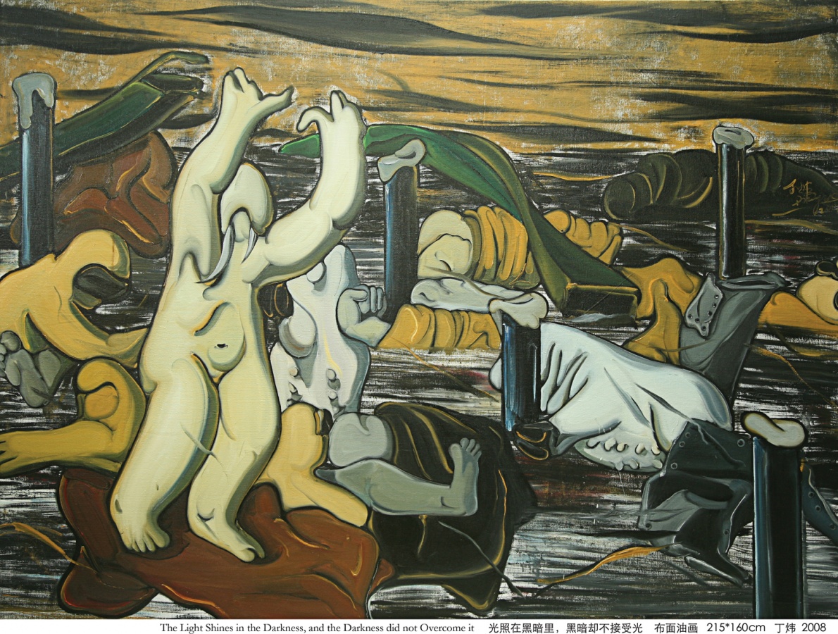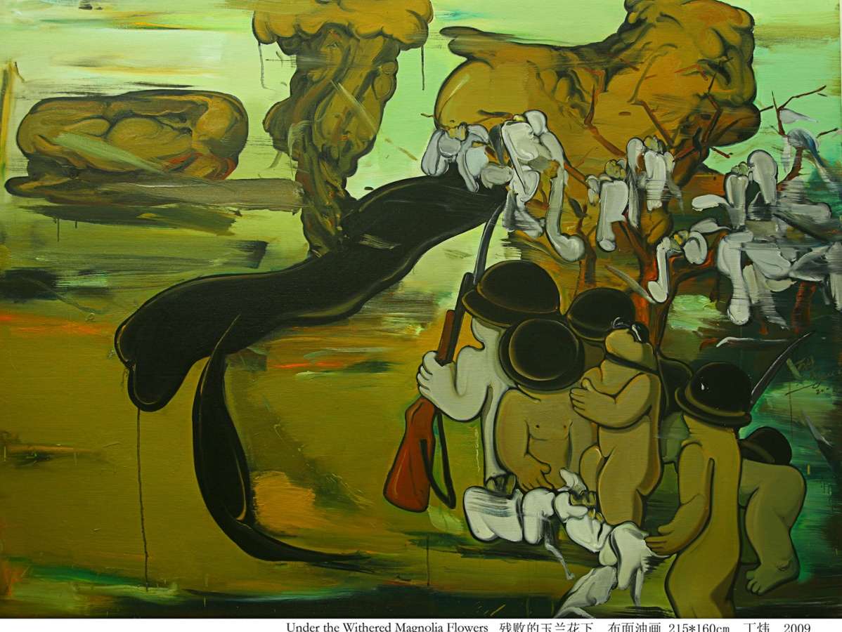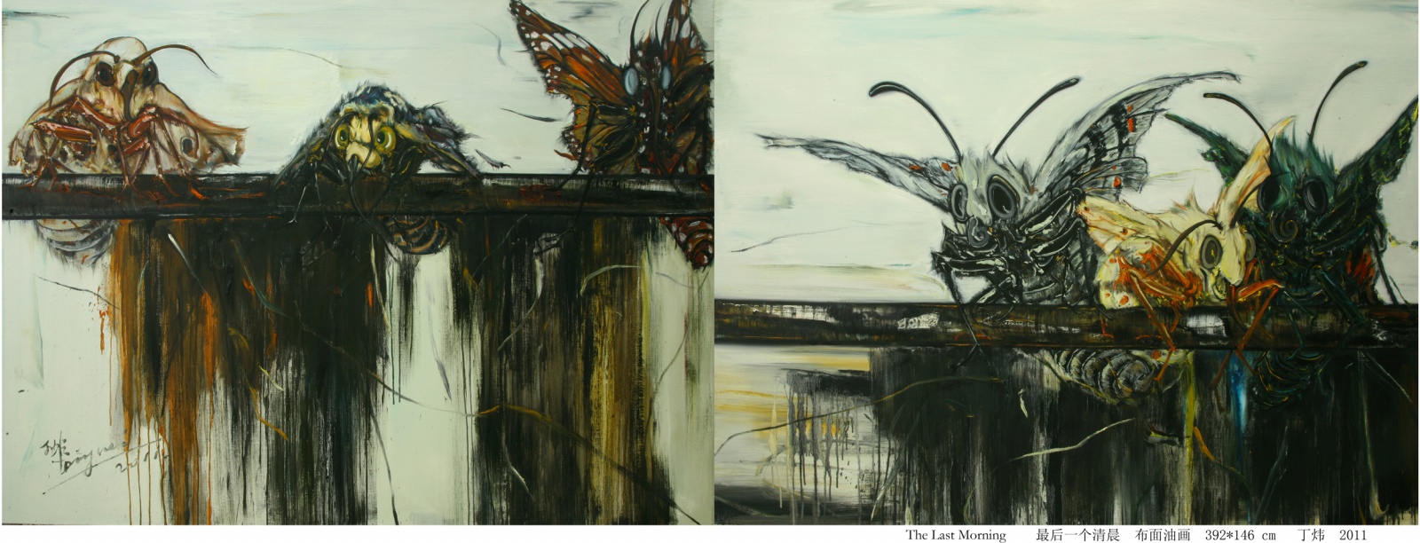 很多年前一个偶然的机会,我通过在云南的策展人管郁达看到了丁炜的作品资料当时就很震惊,后来也是在云南的一次艺术活动上结识了丁炜本人。相对于生于六十年代的那批如日中天一样的中国当代艺术家,生于七十年代的艺术家能够立得起来独树一帜的实在不多,但丁炜的作品让我耳目一新!他的作品没有同时代艺术家的小清新劲儿,没有消费主义的时代烙印,没有自艾自怨的残酷青春,却有着年轻人不容易有的悲怆感、历史感和人文气质,他的创作有比较大的心理格局,他的那些画在暗绿调子的荒原之上的好像战争、灾难、祭祀、迁徙、集市的场景就像是一部年代久远的史诗,也像是某种宗教的启示录,传递着一种强烈的人文关怀和悲剧气息。也有很多作品描绘脆弱的蝴蝶和昆虫力求表达一种对于生命的思考,还有很多纪念碑一样的符号与景物,呈现着作者某种理性与思辨。画风明显受到超现实主义和表现主义风格的深刻影响,画面里建构着荒诞的时空和景物, 也充斥着似是而非的人物和动物,作品不是具体事物和情绪的表达与探讨,更像是关于人类命运的思考与隐喻。后来我了解到丁炜是基督徒也就能够理解他的很多创作所受到的基督教思想的影响了。