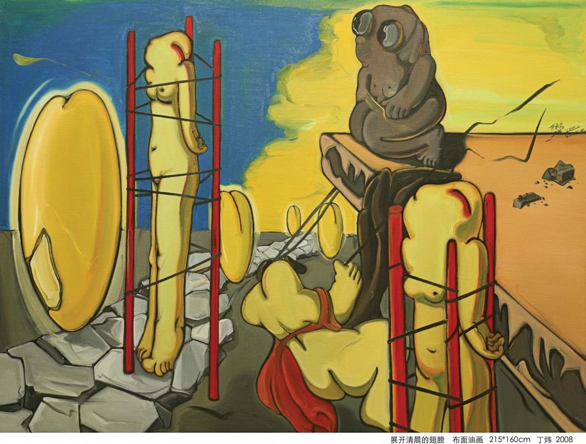 山艺毕业后丁炜顺利地找到了在曲阜师范大学当美术系老师的工作,也就逐步开始了自己的艺术创作生涯,2004年第一次有机会参加一位著名艺术经纪人伍劲在北京策划的青年艺术家群展开始进入了当代艺术界的视野,可惜的是后来一家签约的机构没有做太多的推动,让丁炜的才华没能迅速和更大范围的展现。当时正是艺术市场开始热捧“卡通”的时期,丁炜也被误打误撞地当成“卡通”派的艺术家了,其实他的创作压根跟“卡通”没啥关系。丁炜一直在做的是构建一个自己想象的乌托邦并且让自己在里面像一个英雄一样历经沧桑。