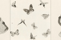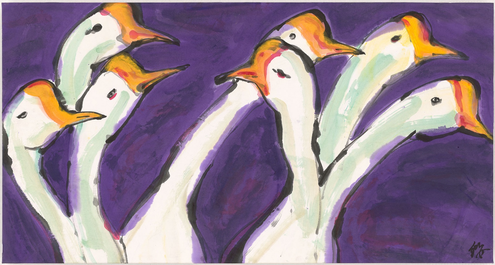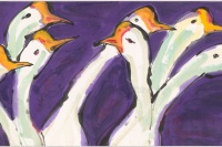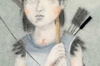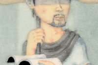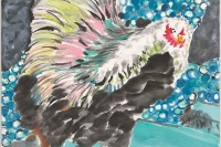 梁缨,1961年生,女承父业,现任北京市黄胄美术基金会理事长、炎黄艺术馆常务理事。梁缨的画,用笔用墨都相当自由奔放,笔墨对于她的意义就在于直抒心境。梁缨特别擅长从细微处入手,《七贤》《两只雏鹰》《何处觅三英》《灿烂鸡翅》,便是从任伯年和父亲黄胄的作品画起,尝试动物在画面中被放大之后的张力感,简洁明快,有着出人意料的兴味生机。《墨池鱼化龙》《天王与老牛》,则是梁缨从石窟壁画出发对佛教和神鬼怪力,天马行空的个人体悟。此批新作的宣纸,还是三十多年前父亲黄胄先生送给梁缨的老纸,故纸新作,水墨新语。
