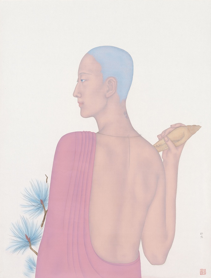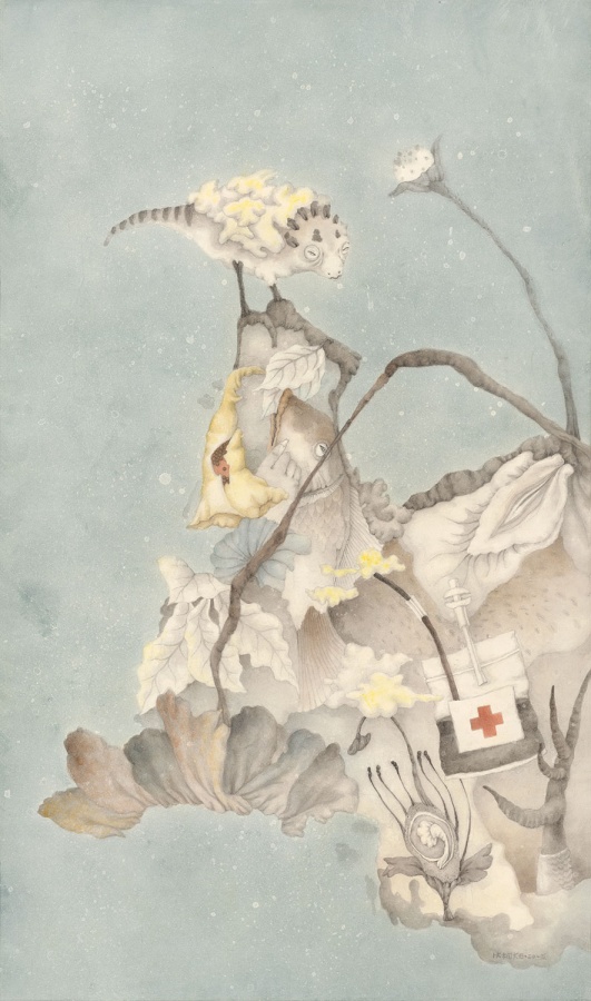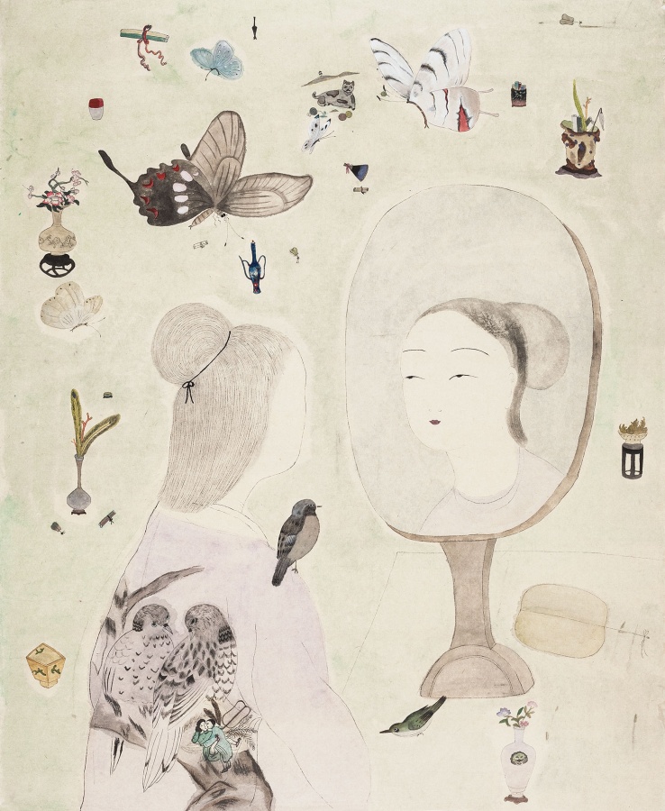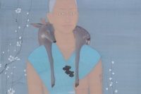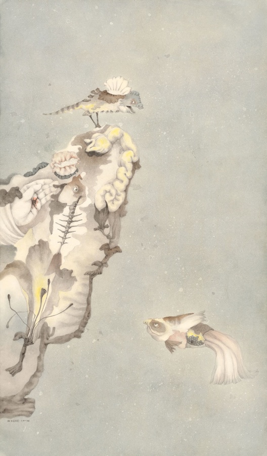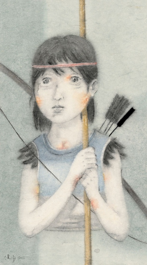 曾健勇、张天幕,是一对同样出生于1971年的艺术家伉俪。曾健勇在人物画和山水画方面,都有创造性的个人建树。他的黑领巾、大队长系列塑造了新时代的中国少年面孔。此次参展的《耕读者》和《狩猎者》,则是曾健勇成功塑造的具有时代象征感的成年人 “东方新面孔”现实标本,被社会及家庭规训所界定身份的男人和女人,怀揣着逃逸归隐的强烈意愿,悬浮图式被赋予双重性隐喻。山水画《诸野》出自“礼失而求诸野”,是曾健勇关于山水画当代性的解读,重新观察自然,回到古人的起点,从传统构图出发创造出现代人心中所向往的山水之美。张天幕早期作品呈现的是童话里的梦幻世界,有些不知所措的小女孩仿佛身处精灵世界,被拟人化的花草、小兽和小鸟包围,甜美、单纯。张天幕的近作,依旧延续了之前超现实主义风格的画风和纸上坦培拉的技巧,然而,画面的戏剧性变得更加富有想象力,此前绘画中扮演辅助性角色的花草、鸟兽成为了画面的主角,有了更现实的诉说力量感。
