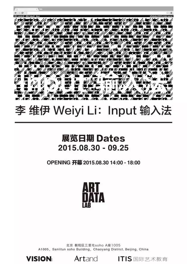 ART DATA LAB将于2015年8月30日举办“Input输入法”李维伊个人项目,由李维伊设计的Labrinth.ttf和Today.ttf两款字体及其网站正式发布,同时还会发布由rePubliaction再版社出版的三本书。