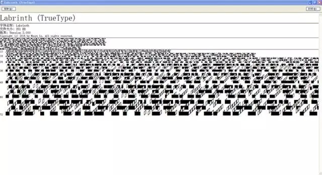 Labrinth.ttf和Today.ttf是在这个动机之下发展出的两个字体。同条码那样极致的抽象不同,Labrinth.ttf借鉴了迷宫的形象(对于文字来说,迷宫或者是一个太老套、但至今仍然有效的意象)。使用这个字体输入任何一段文字即是建造一座迷宫。迷宫的每一个单元,即每一个字符形象都建立在正交坐标体系而非透视体系里,使得输入文字所建立的的整个空间得以无限延伸。有趣的是,若检视在window系统中的字体预览界面,系统自带的将字体从小到大的展示方式,造就了在一个完美的透视体系之中的,逐渐缩小消失在地平线之上的迷宫。