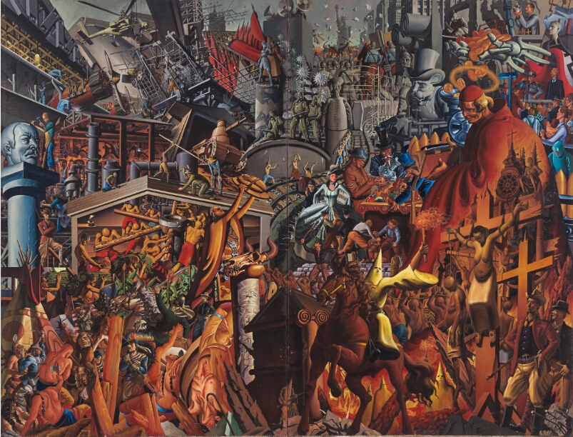 陈李是一位辨识度非常高的艺术家,他的作品以抽象的隐喻表现手法著称,擅长运用超现实主义的隐喻及联想来表达他所感知的周遭世界,充满另人震撼的独立意识及自我反省精神。在作品中,他习惯密密麻麻地填塞大量历史人物、日常用品、动植物、想象中的外太空以及各种其他怪诞事物,并将这些似乎鲜有关联的对象以一种无厘头又有序的方式嵌入绘画中,构成幽默、空想、荒诞和神秘的场景。