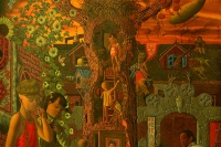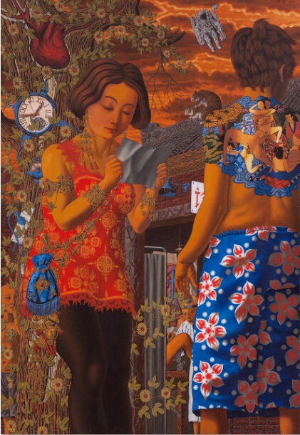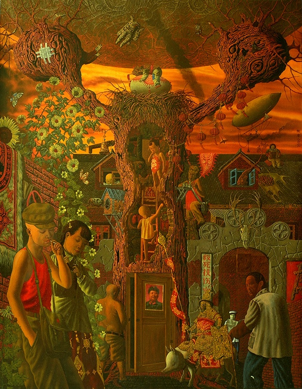 树、女性子宫和婴孩也是陈李作品中不断重复的符号,这在《树上的蛋》、《约会》、《新革命计划书》等作品中得到很好的体现。在《约会》中,一棵子宫形态的树占据着画面的主要位置,树里一个小男孩正抓着木梯,奋力向上方一个小女孩爬去,就像卵子和精子的相会。画面上的其他具有指涉性的形象则让人浮想联翩:树的下方开了一个贴着老毛头像的半虚掩的门,一个光头光着膀子的男人似乎正向门里走去,或者是在偷窥;树的右方是一位盔甲武装的骑着猪的人……这些烙上时代色彩的符号构成了陈李想象中的恋爱场景。他今年的新作《小时代》则开始思考现代社会中日趋平常化的“人流”现象。