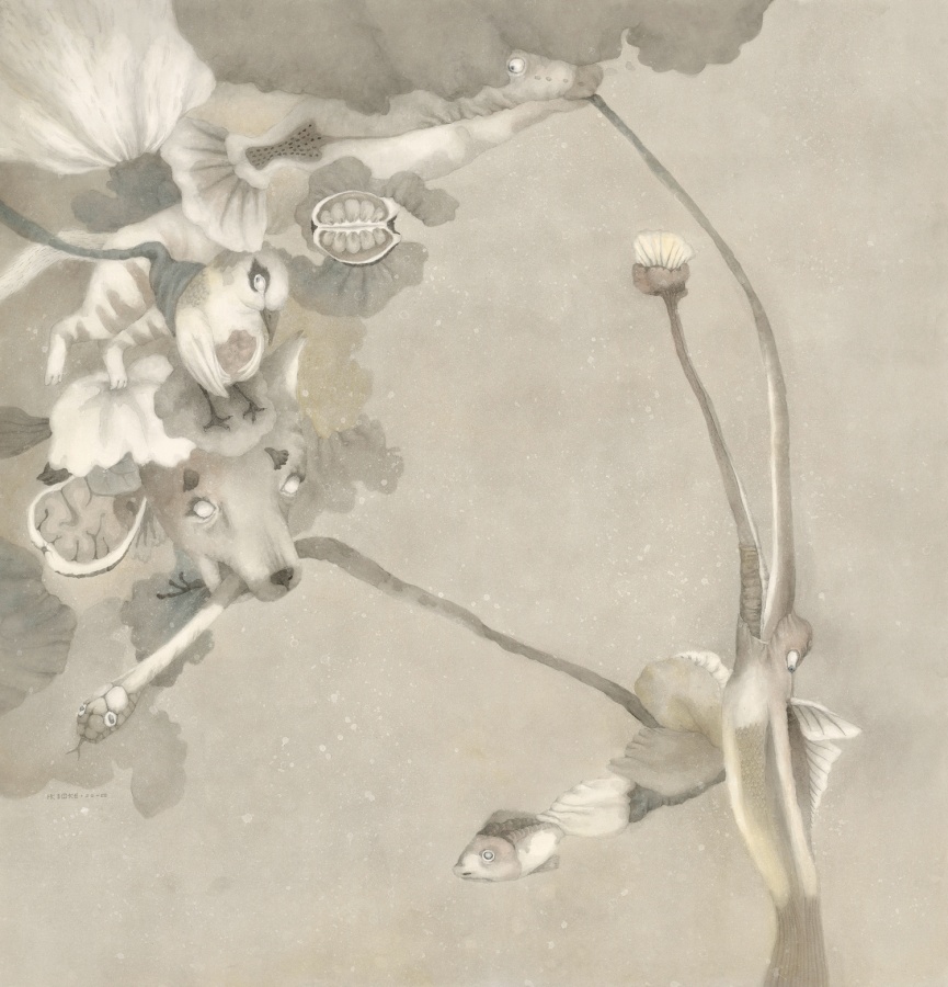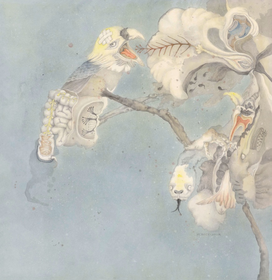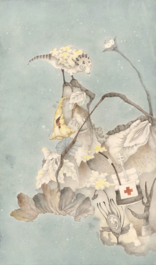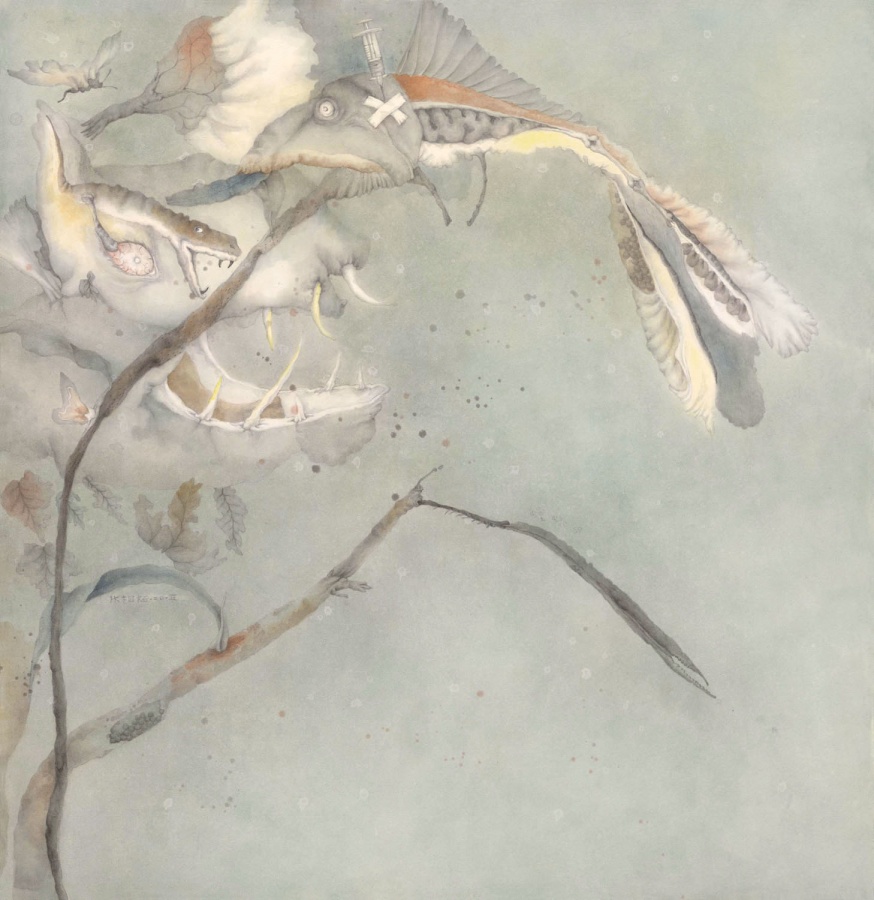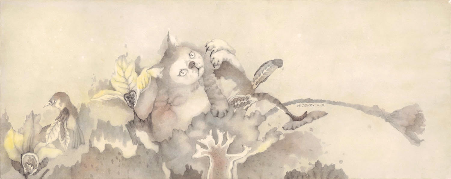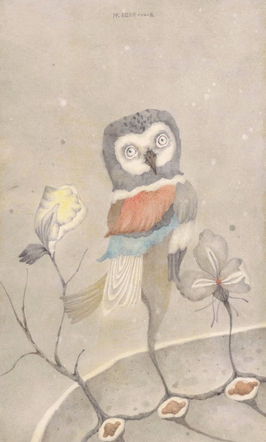 对于熟悉张天幕创作的人而言,她的这批新作品展现了出人意料的新方向:她舍弃了标志性的梦幻一般的小女孩形象,将原来在画面中扮演辅助性角色的花草鸟兽变为主角。原来精心维系的那种甜美、单纯、“绯色梦境”一般的气氛消散了。