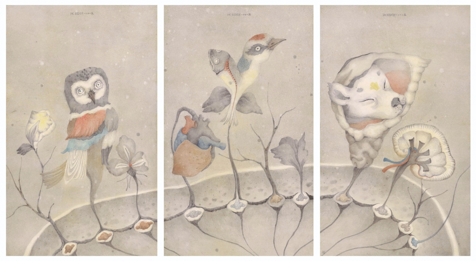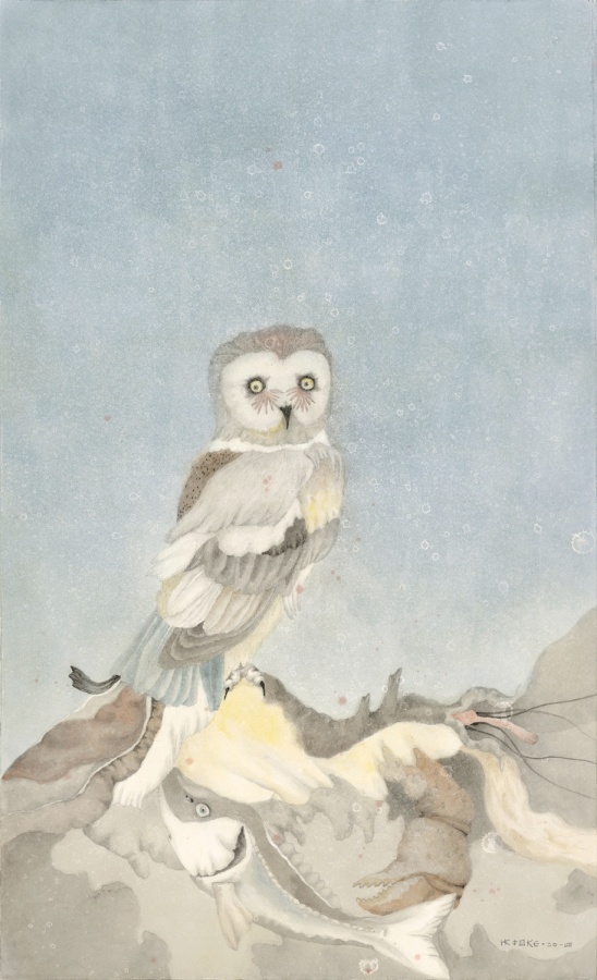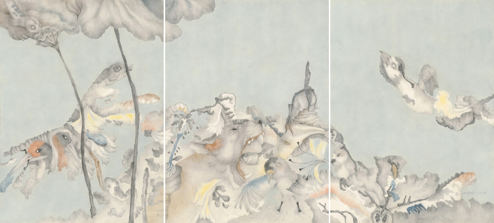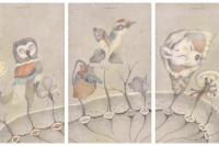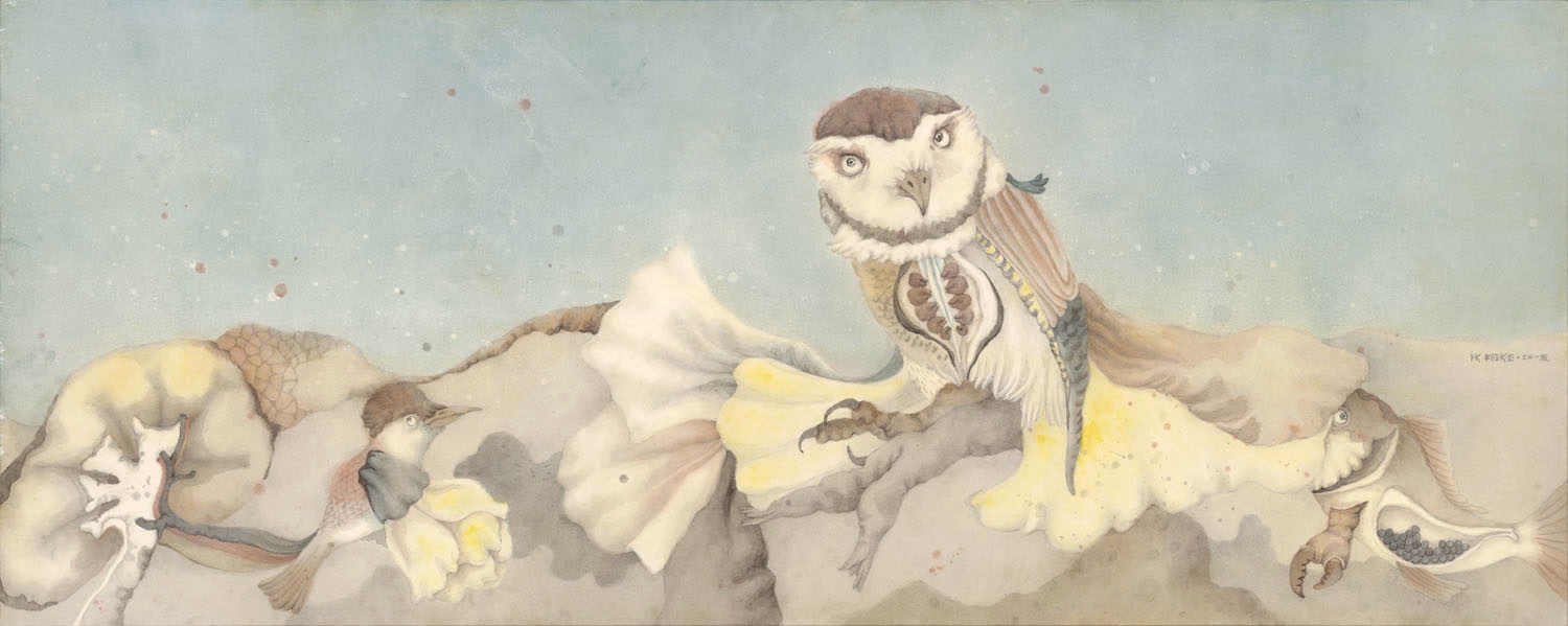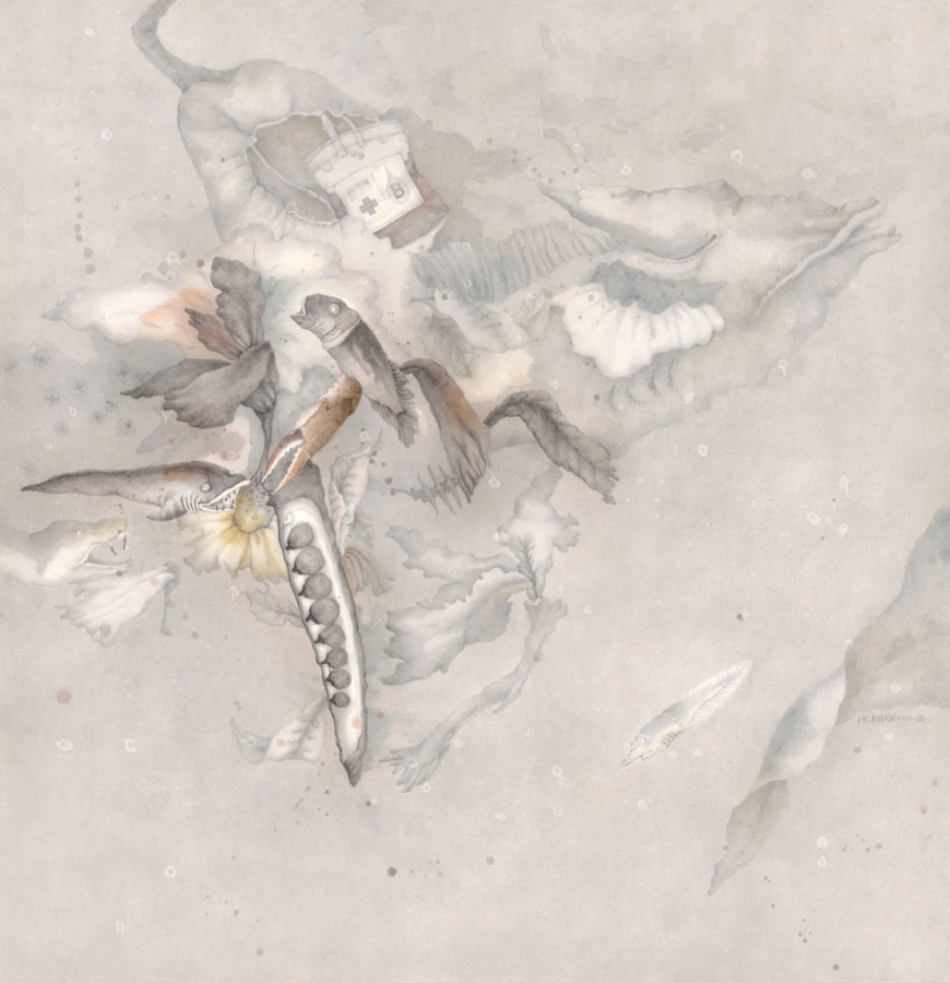 对于熟悉张天幕创作的人而言,她的这批新作品展现了出人意料的新方向:她舍弃了标志性的梦幻一般的小女孩形象,将原来在画面中扮演辅助性角色的花草鸟兽变为主角。原来精心维系的那种甜美、单纯、“绯色梦境”一般的气氛消散了。