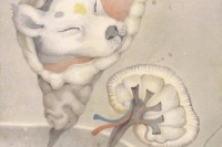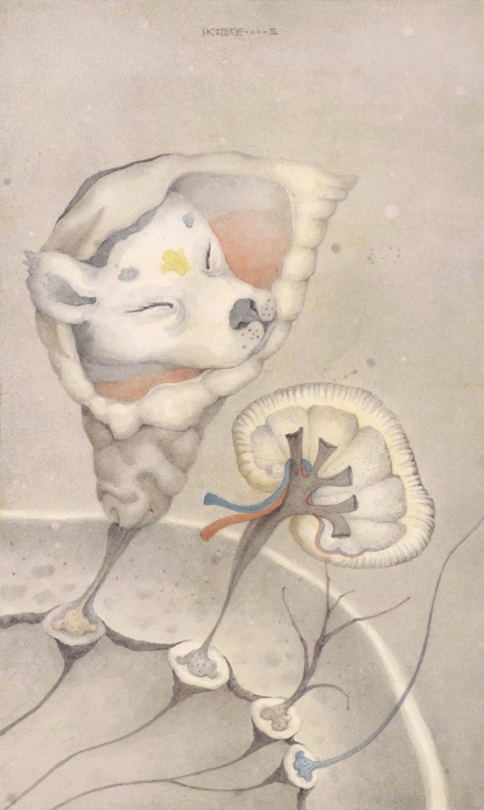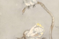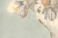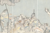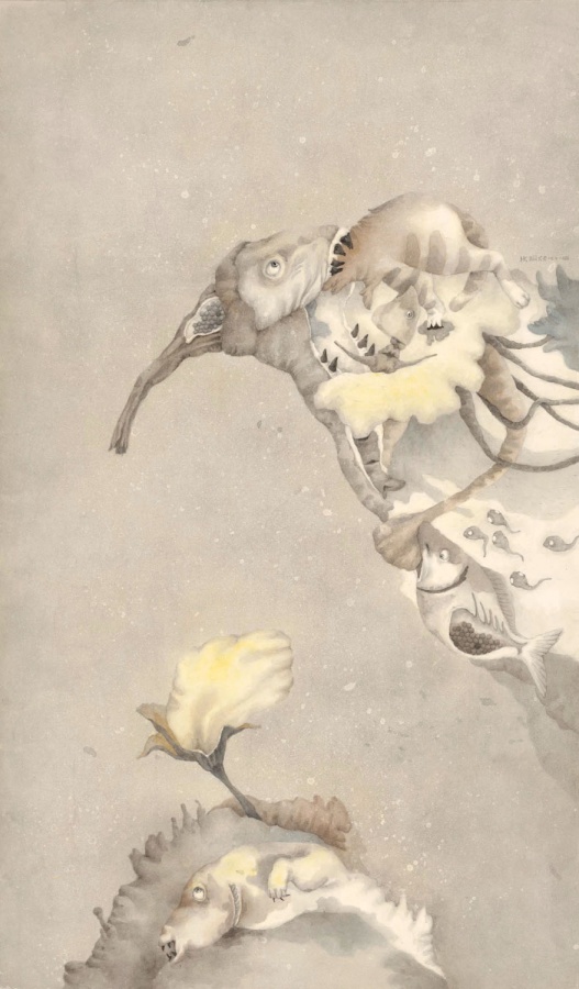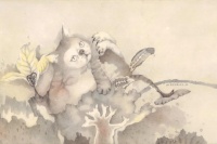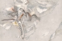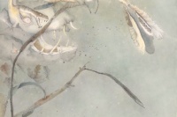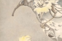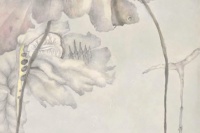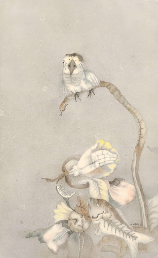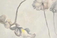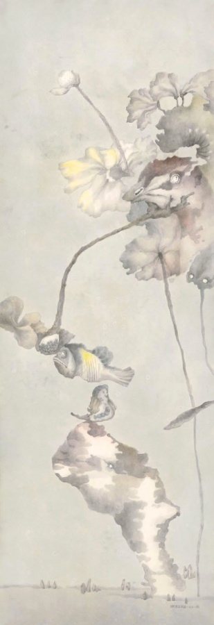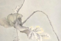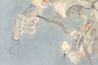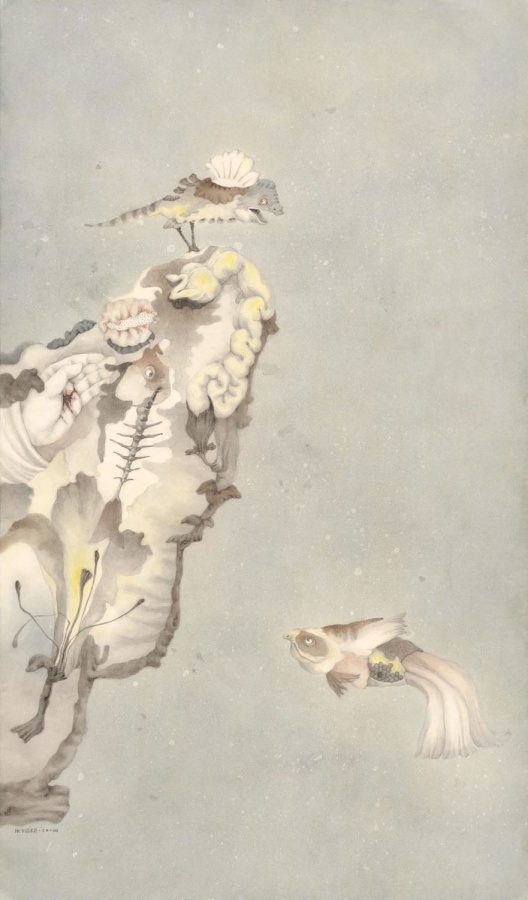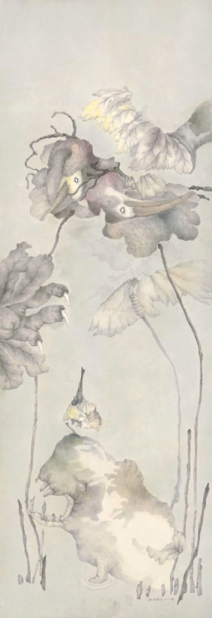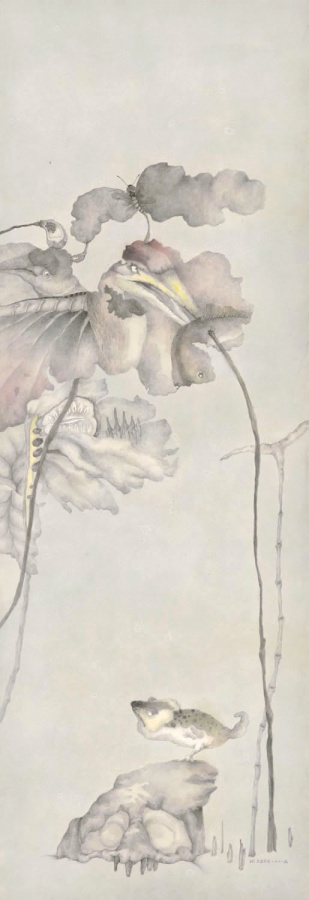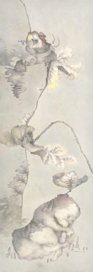 我们可以说张天幕的这组绘画是传统花鸟题材在当代的一种变异,而她所遵循的不是传承有序的路径,而更像是一种偷袭:以出人意表的方式深入到传统的内部,并发动了一场小小的颠覆,使作品的气息为之一变。她敏锐的捕捉到朱耷作品中“鱼鸟互化”、“鸭石一体”的“善化”特点,而在她的作品中却变成叶子的边缘长出爪子,巨蟒的口中开出花朵。 如果说朱耷原作所传达的是一种“庄周晓梦迷蝴蝶”的哲学冥想,而天幕的画面却令人联想到现代生物科技背景之下人们对生命本身的焦虑和不安。