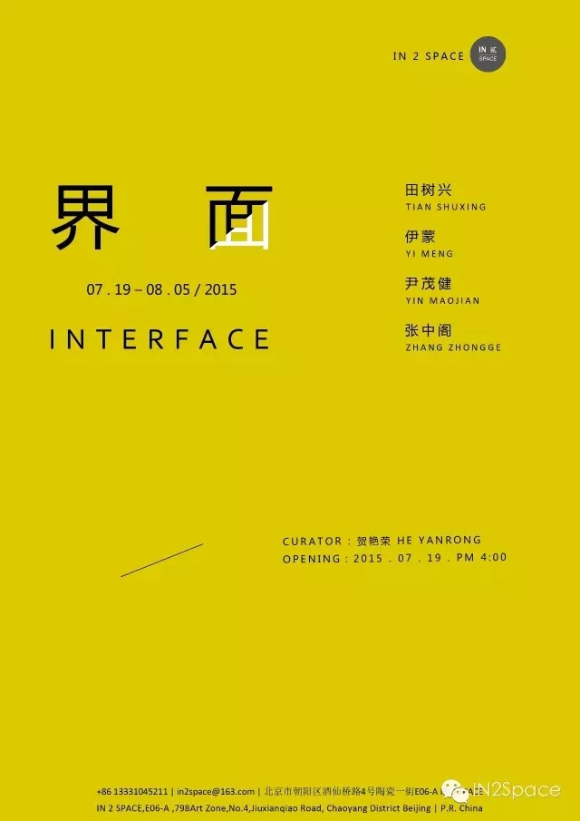 我们很荣幸的宣布,“界面”群展将于2015年7月19日下午4:00-6:00在798艺术区IN 2 SPACE开幕,此次展览,将要展出伊蒙、尹茂健、田树兴、张中阁四位青年艺术家的冷抽象作品。这四位艺术家的作品无论从材质、形式还是观念上,都呈现丰富的多样性。他们正以特有抽象的语言介入多重可能性,简练而且力量。