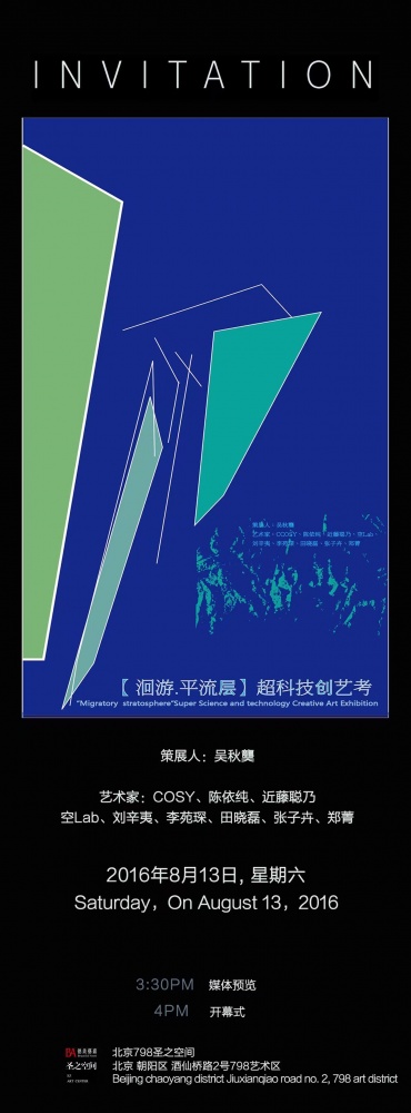 由中国对外文化交流协会主办, 北京德美艺嘉文化产业股份有限公司承办,中展德美(北京)展览有限责任公司和圣之空间协办,国家艺术基金支持的“『洄游 平流层』 超科技创艺考”艺术展将于2016年8月13日(本周六)在北京798圣之空间开幕;展期将持续十天至8月23日。