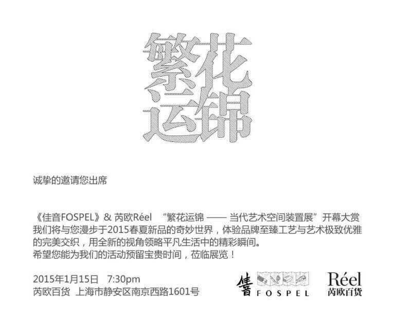 2015年1月15日晚7:30,上海,《佳音FOSPEL》&芮欧Reel“繁花运锦--当代艺术空间装置展”将在芮欧百货举行开幕大赏。