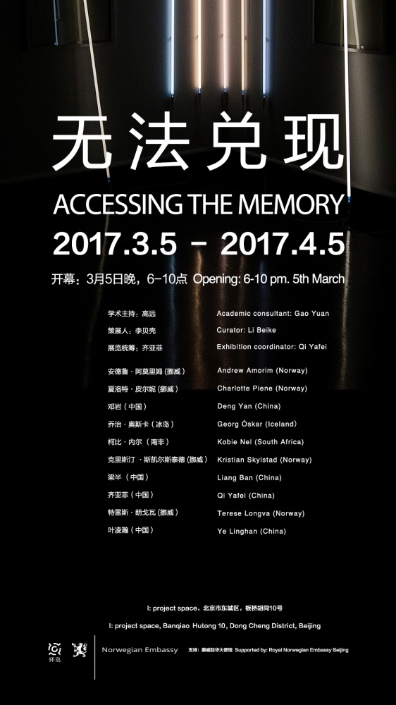 艺术家:Andrew Amorim (挪威),邓岩(中国),梁半(中国),Terese Longva (挪威),Kobie Nel (南非),Georg Óskar(冰岛), Charlotte Piene(挪威),