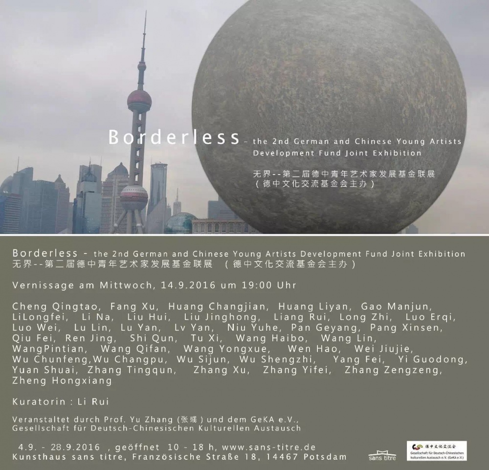 《无界——第二届德中青年艺术家发展基金联展》将于2016年9月4日——9月28日在德国波茨坦Sans Titre美术馆隆重举行,本届主题展由德国著名机构德中文化交流基金会主办,展览由中国知名策展人李蕊策划。本届展览延续上届德中文化交流基金会主推中国当代青年艺术家宗旨,特别邀请中国当代青年艺术家参加,不仅为他们在德国提供一个国际化的展示舞台,展览又将亮相于9月德国艺术周,如同展览主题为无界一样,有着中德艺术交流与融合的特殊意义。