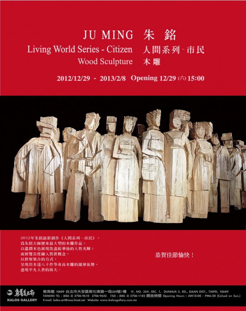 真善美畫廊將於2012年的歲末隆重推出年度壓箱大展,邀請國際知名藝術大師朱銘展出2012最新木雕創作個展《人間系列—市民》;在這一個系列的全新創作中,朱銘透過數量達八十件,歷來最大型的木雕,為凡常百姓造像;作品全然以木頭原色呈現,訴說所有的生命裸呈而來,同樣平等、卑微與高貴;而所使用雕刻之香杉木色溫潤、質樸芳香,透露人世的喜樂與光輝。朱銘更師法古代佛像以莊嚴為菩薩法相,而取尊嚴與溫情為凡人面相,讓市民雕像煥發人性容光;並透過群體裝置,展現數大美感,呈現更超越以往的雄渾氣勢,喚起觀者自心底油然而生的崇敬。