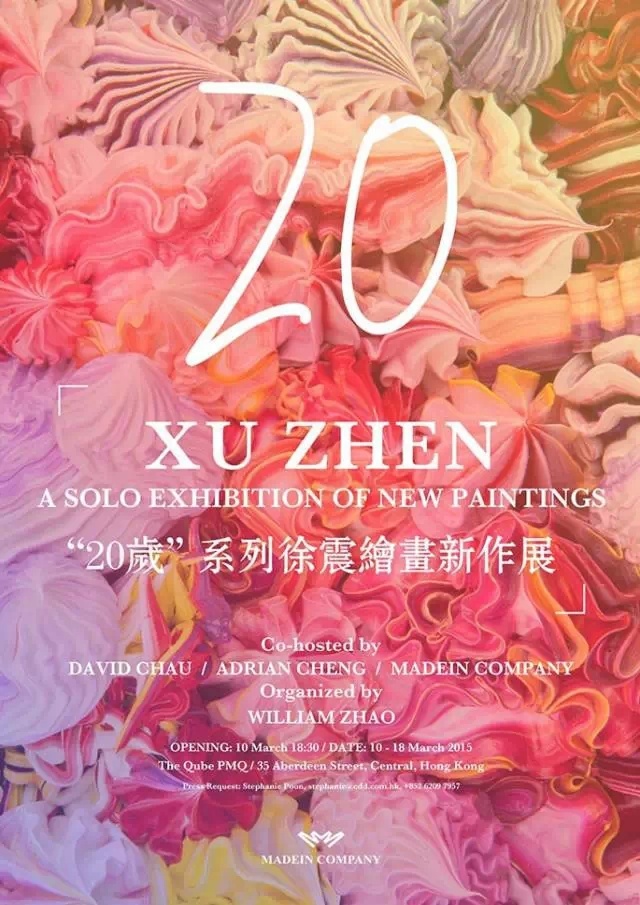 徐震全新「20岁」系列绘画首展,将于2015年3月11日至18日在香港PMQ展出, 由没顶公司联合策划人郑志刚先生、周大为先生共同推出,由赵令勇先生组织。展览以发布会概念打造,艺术品如同奢侈品般陈列,画面放大的局部特写广告幕墙,投射倒影在镜面展柜周遭,环绕现场的视频广告加强视觉符号,制造出奢侈迷离、五彩夺目的观赏体验。展览将艺术家“艺术品就是商品”的理念,推进至新的视觉与解读层次。斑斓色彩在空间的碰撞激发出令人难以抗拒的佔有欲,一席狂欢飨宴就此开启。