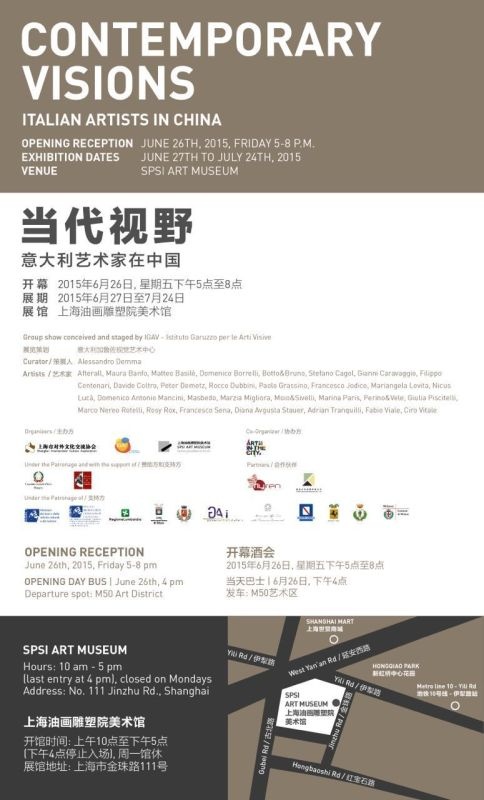 “当代视野—意大利艺术家在中国”由上海市对外文化交流协会、意大利加鲁佐视觉艺术中心与上海油画雕塑院美术馆主办,艺术都市协办,由Alessandro Demma策展。展览展示当代意大利艺术家们最重要的一些经历和体验,通过年龄从25岁到50岁的29位不同年代艺术家的作品,彰显了当代艺术的几个主要阶段。展览开幕为6月26日周五下午5点至8点,展览从2015年6月26日持续到7月24日。