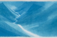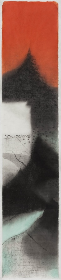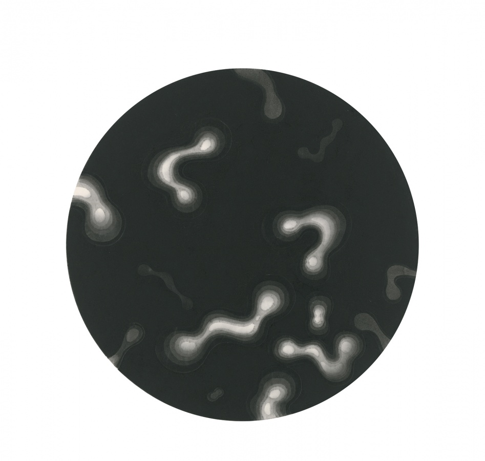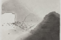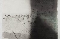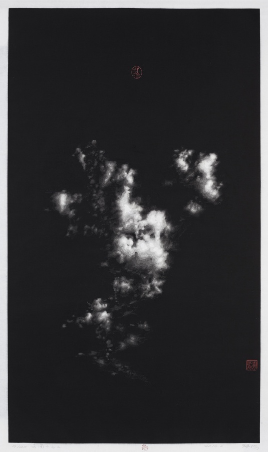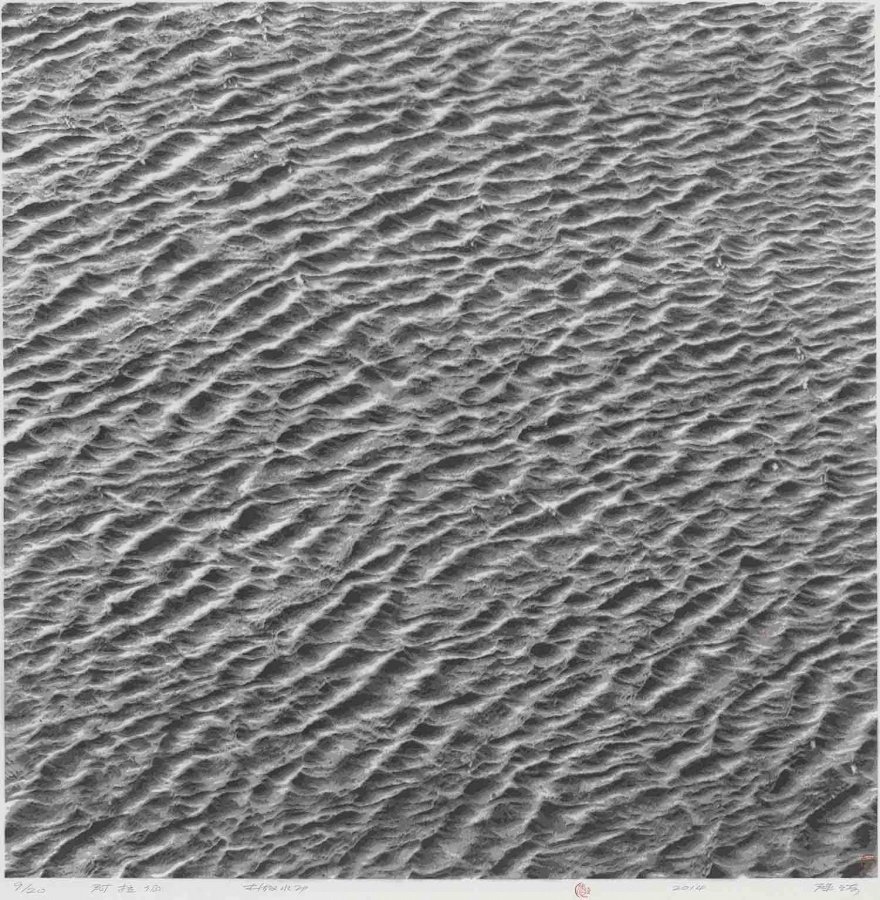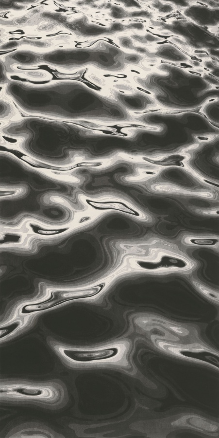 陈琦之前作过多幅《水系列》版画。早期画面平滑旖旎,水纹作千姿百媚的流转,浸润着浪漫的汁液。而之后,《水系列》一幅幅的愈见沉重,日益粘稠晦涩,到《2012》终至固化。