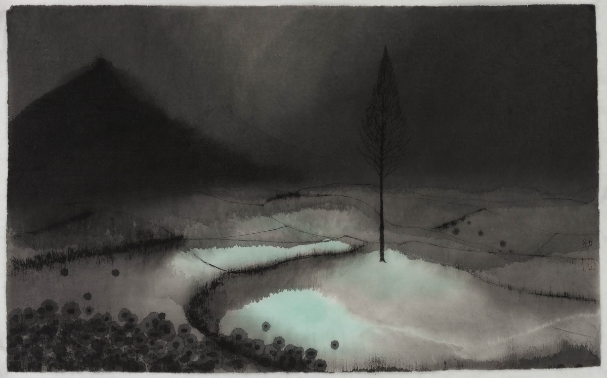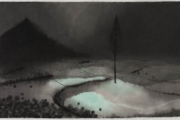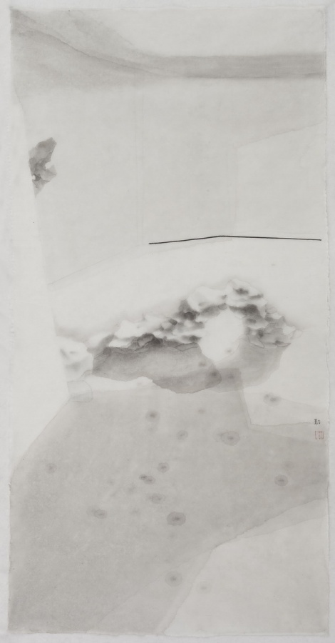 回头看他的画。近来沈勤的东西多为“顺心”之作,似乎是随性流淌而出。但千万不要被他画面的“无辜清新”所迷惑。他“很用心的去画一张简单的画。”平淡出手,背后多少机心!沈用一派“纯真”,组织其不易提防的视觉陷阱,人们往往被这些心不在焉的平淡给“蒙”了。沈的机关用心,隐藏在半遮半露的山石后;溶解进水渍墨痕的精细边纹里,潜行于似乎“无笔”的大片平涂中。所谓“细微之处见精神”,读读他的口供:“……我对蘸墨的感觉,水蘸上淡淡的墨,在宣纸上流动与控制的痕迹,令我非常兴奋。再比如画树,我有时候用木炭条,涩涩的非常松动的细节,非常舒服。”还有,“绝对不能忍受画面中多出一些乱七八糟的东西,笔笔之间一定是有控制的节奏,确保画面最终的洁净。”他要的是“对画面最精炼的追求。”