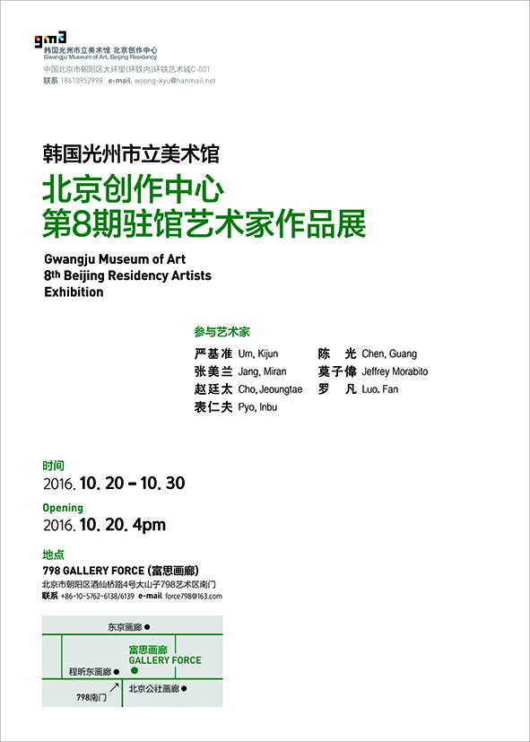 由韩国光州市立美术馆主办的 —— 北京创作中心第8期驻馆艺术家作品展,将于2016年10月20日下午4时,在北京798艺术区南门“富思画廊FORCE Gallery”开幕,届时将展出七位韩中驻馆艺术家的近期作品,展览将于2016年10月30日结束。