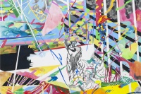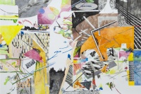 作为一位跨越绘画和装置等多个领域的年轻艺术家,毕蓉蓉近年来以简洁而准确的形式获得了广泛的关注。在本次展览展出的“曼彻斯特CMYK”系列作品里,我们能看到支离破碎的图案,以及穿梭在它们之间的直线或曲线。那些线条似乎把图案碎片所属于的,各自不同的时空连缀到一起。这与她在之前的装置作品中使用的,划分空间感知的实体直线异曲同工,它们似乎都是对破碎的时空感受的隐喻,或者说,来自艺术家拼接不同时空,并展现这一魔幻过程的愿望。