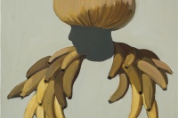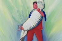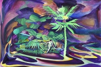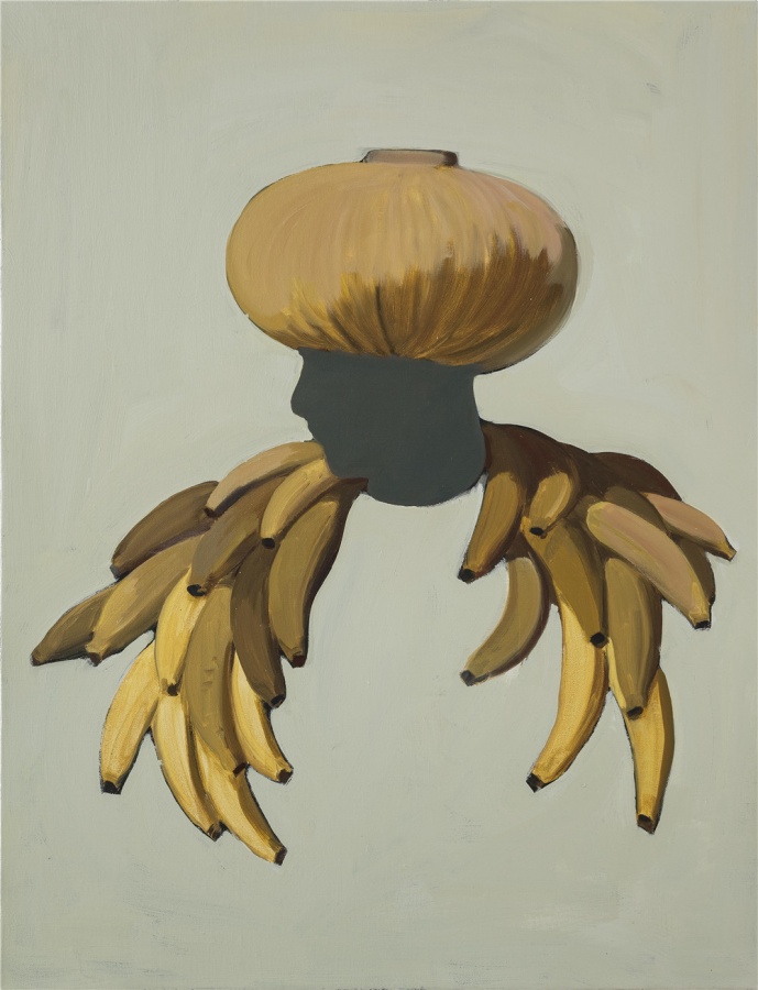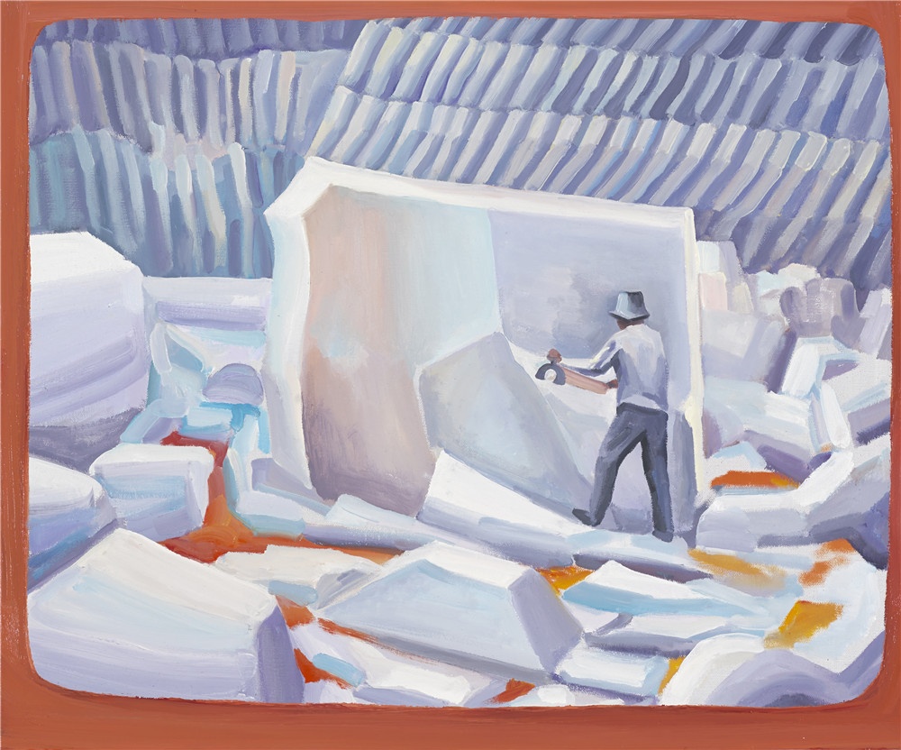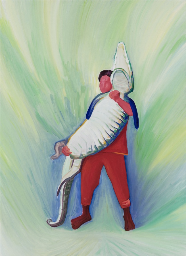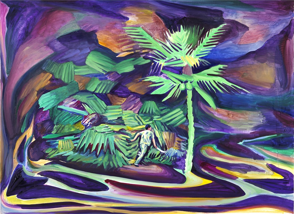 在余果的绘画里,无论是捧着鳄鱼的人,在石质屏风前工作的工匠,在穿军装的人面前跳舞的仙女,或者是手持大刀,在椰子林里奔跑的人,他们都不属于任何统一的意境或整体的理念设计,也不是关于任何社会性或政治性的表述——尽管有些场景是带有这类色彩的,它们更像是画家对自己不断产生的碎片化的念头或情景的记录,一种带有自省色彩的,心理日记般的,关于自我内心世界的描绘。转瞬即逝的心理画面是难以记录的,而画家必须以色彩和画面的结构来重现那些很容易在视觉信息中丢失的,抽象的心理感受,这也正是画面的色彩与内容之间呈现出张力的原因。这样一来,我们就能发现,作品中叙事结构的破坏并不是刻意的,而是基于对绘画的本质,也就是画家与画布之间的关系的确认:画面是传递画家内在感受的通道,而不是建立某种观点的工具。由此,对绘画技术的实践也才建立在内在情感的需求之上,并显出其意义。