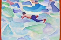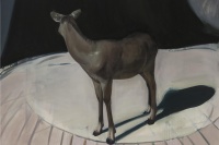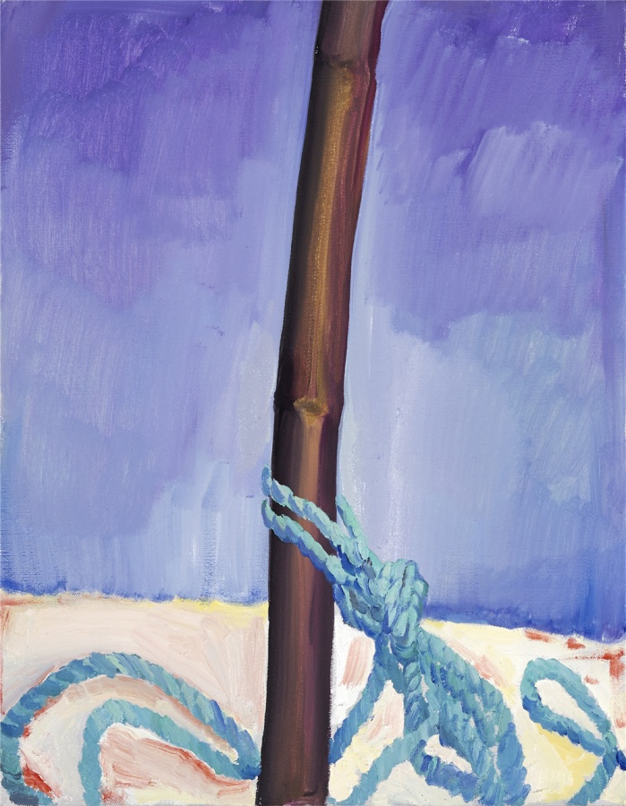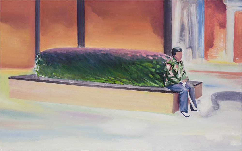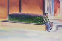 余果喜欢用简洁的内容描绘略显晦涩的场景。画面上的主体明确,内容并不多,显得非常安静,却又暗流涌动;让人在很快确认画面结构的同时,忍不住去观察每一个细节,并开始自觉的编织出怪诞的情节。同时,他的色彩是鲜艳的,这种对比强烈的喧闹色彩,和安静的画面形成了强烈的反差,让画面同时具备了明朗和灰暗的感觉。所谓灰暗并不是视觉上的,也不是情绪上的,而是来自晦涩的场景带来的感知体验,伴随某种一触即发的幽静和神秘感。这种对画面的控制也许来自余果不自觉的性格,或者他有意无意的,在绘画空间中制造出的离间效果。总之,这种一目了然的层次感是我们观看他的绘画的第一印象。