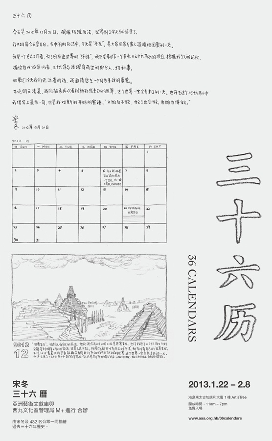亚洲艺术文献库(文献库)宣布与 M+进行合办之大型展览《宋冬:三十六历》将于 2013 年1月21 香港太古坊 ArtisTree 举行。此项目为国际知名中国艺术家宋冬在香港的首次个人展览,并将于开幕日邀请超过 400 多名公众与宋冬一同完成作品。此项目的概念源于宋冬去年10 月及今年1月在文献库的驻场计划,他更以超过一年的时间去实践这个庞大的项目,透过绘制挂墙年历去叙述他记忆中自1978 年至2013 年,共三十六年的历史,题材均围绕社会政治历史、个人经验以及艺术史等宋冬一直所关注的议题。