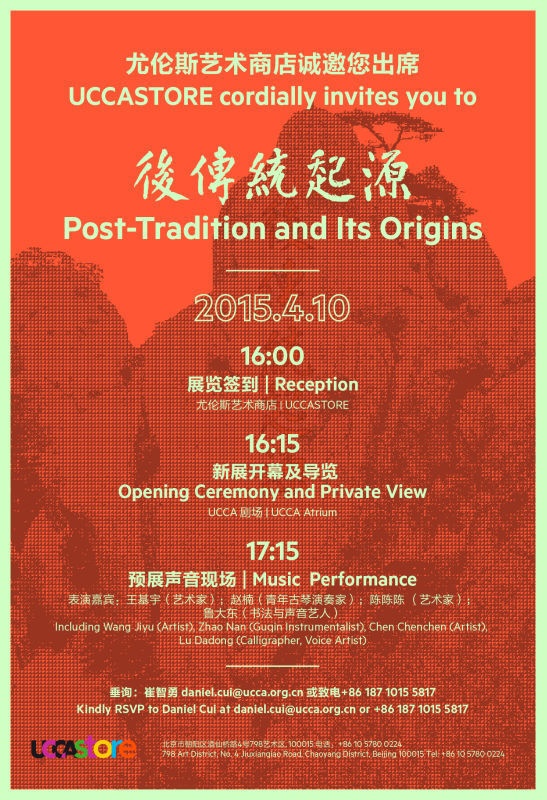 尤伦斯艺术商店(UCCASTORE)即将于2014年4月10日至5月31日期间举办展览“后传统起源”,邀请34位/组杰出的中国当代艺术家参展,呈现百余件作品。本展由知名策展人付晓东策划,参展艺术家包括:擦主席、陈陈陈、董文胜、龚旭、蒋志、姬子、梁硕、林海钟、李继开、李嘉儒、鲁大东、马骏、欧阳文东、潘汶汛、彭薇、撒旦君、申亮、史金淞、塔可、仝天庆、王秉复、王基宇+赵楠、王濛莎、王煜、邬建安、吴俊勇、吴强、武艺、想象力学实验室(汪泓)、姚媛、曾扬、张云垚、赵文悦、朱利页。其中,陈陈陈、王基宇+赵楠、鲁大东受邀在UCCA剧场进行现场声音表演,欧阳文东将现场焚香,强调在地性和体验性,以多种媒介诠释“后传统起源”这一主题。