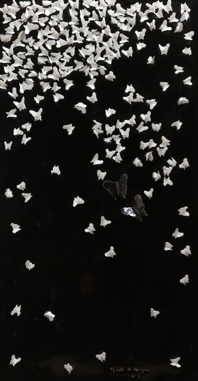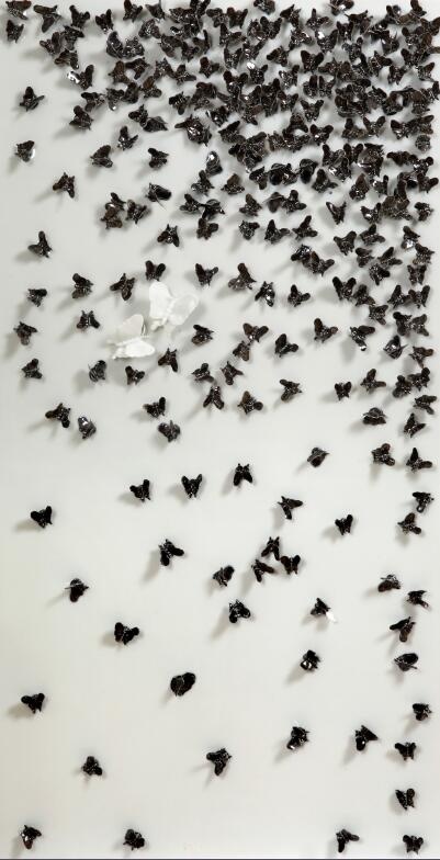 相对于其以往展览中展现的关于权力、情欲和死亡这一类主题的作品,本次展览中何汶玦建立了一个新的内在联系,他将过去绘画作品中的叙事性和伤感情结代入了这次展览的作品中,抽象的绘画《水》和陶瓷装置《梁山伯与祝英台》中的蝴蝶代表着流动与漂浮,它们的灵动同其他青铜和黄金作品的沉重和压抑相斥,如同欲望都市中权力的游戏背后那些伤感和别离的情绪。