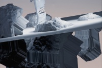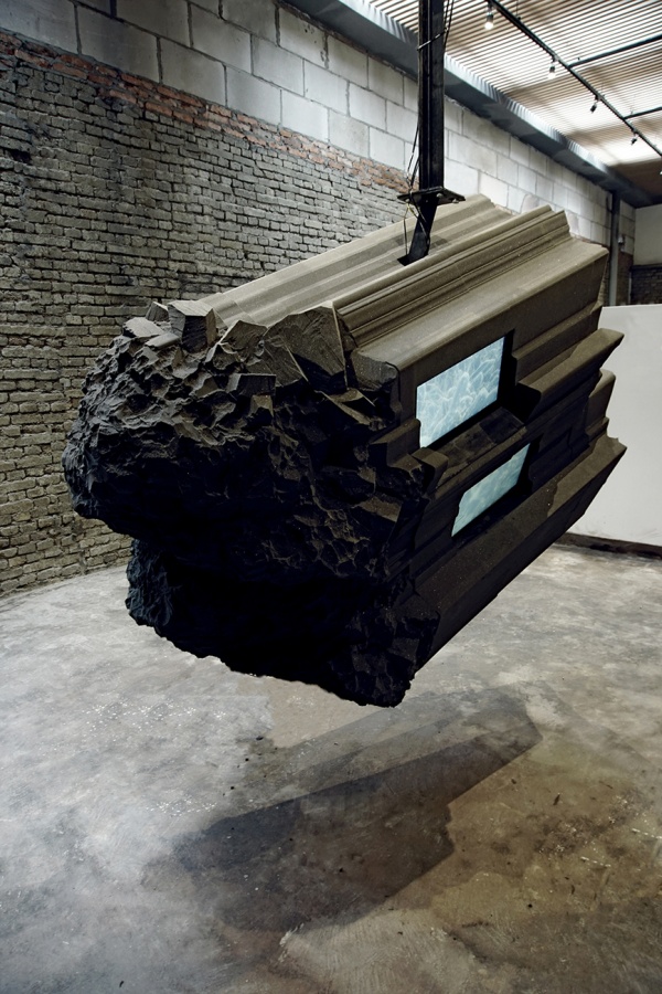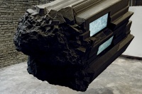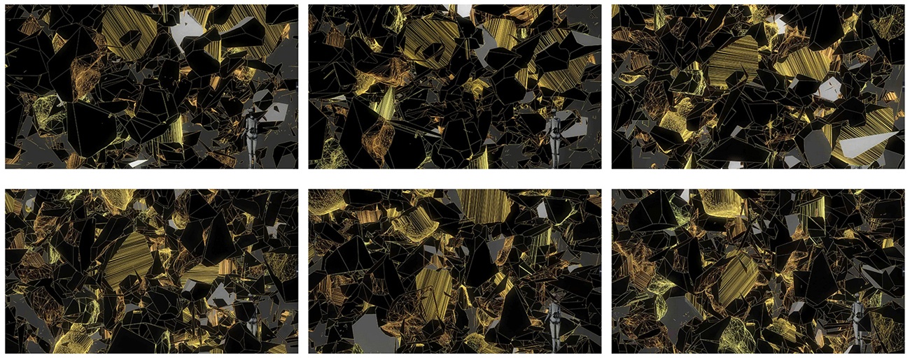近期的新作《错误的秩序——废弃》和《时光的额外维度》则几近于一种空间拓扑学,来探究各种“空间”在连续性的变化过程和失控状态下持存的性质。其中《错误的秩序——废弃》中数字形象的来源完全是一颗现实中的矿石,艺术家将其形象原样输入电脑后,又随机的进行了破碎和重组,保留它在虚拟环境下被修改的过程痕迹,使其以乱码的电子断层出现,并定格这一变化中的随机形象,通过这种反常规的体验,艺术家将创作过程引入到一种充满悬念和未知的失控状态,而这为思维和认知的延展打开了全新的维度。