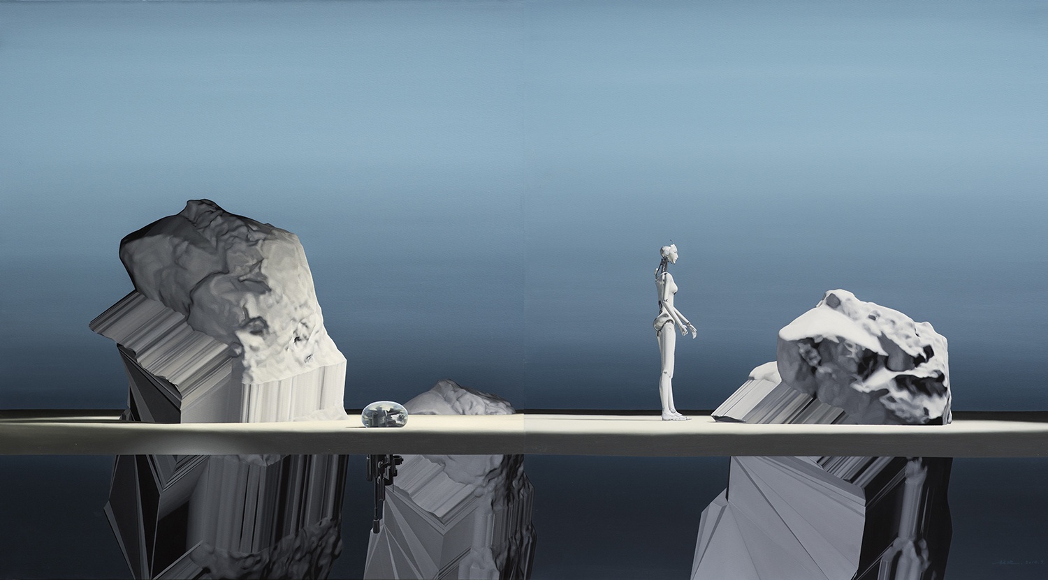 绘画在林欣笔下被定格为几似动画静帧的图像,人为迹象的刻意掩盖和藏匿,意在表明一种消除绘画的立场和指涉人的异化之隐喻,她在绘画中着重捕获了电子虚拟技术中的BUG状态,也既是一种软件程序错误,艺术家不再直抵完美结果,而是流连于过程的失控和视觉显现。在这里,机器或者说程序同等地获得了一种和人为相一致的行为机能,以至于我们已经无法分辨,哪些是人为部分而又有另外那些是程序本身的作为。